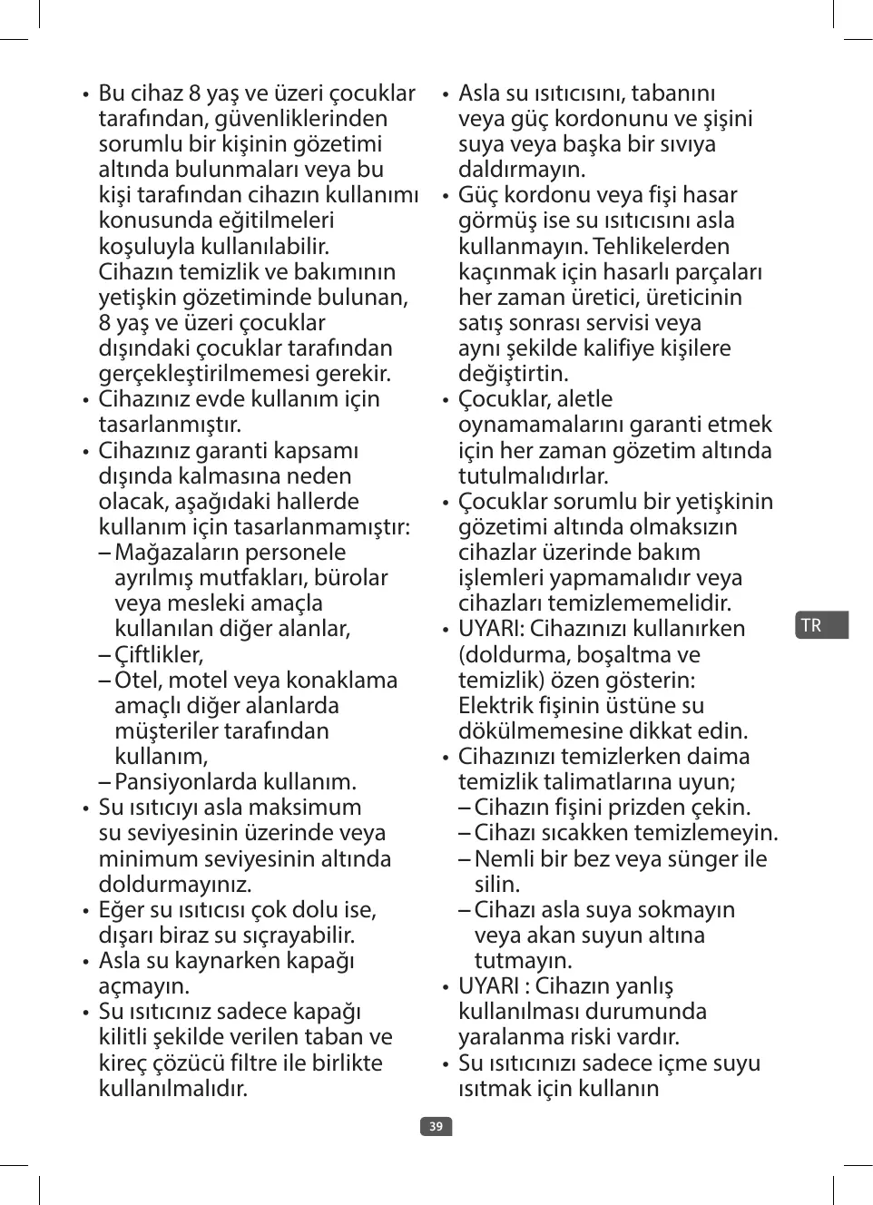 • N’utilisez votre bouilloire que pour faire chauffer de l’eau potable. • AVERTISSEMENT : La surface de l’élément chauffant présente une chaleur résiduelle après utilisation. • Assurez vous de ne toucher que la poignée de la bouilloire pendant la chauffe et jusqu’au refroidissement complet. • Votre appareil est destiné uniquement à un usage domestique et à l’intérieur de la maison et à une altitude inférieure à 4000 m.