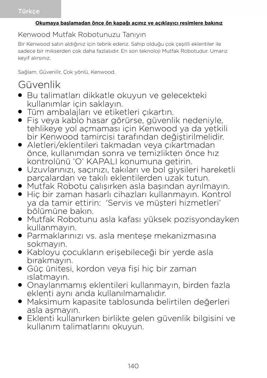 Lisez et conservez soigneusement ces instructions pour pouvoir vous y référer ultérieurement. O Retirez tous les éléments d’emballage et les étiquettes. O Si le cordon ou la prise sont endommagés, il faut les faire remplacer, pour des raisons de sécurité, par Kenwood ou un réparateur agréé par Kenwood pour éviter tout accident. O Mettez la commande de vitesse sur la position “ O “ OFF (Arrêt) et débranchez avant d’installer ou de retirer des ustensiles / accessoires, après utilisation et avant toute opération de nettoyage. O N’approchez pas des parties de votre corps, cheveux, bijoux ou vêtements amples des parties en mouvement et des accessoires installés. O Ne laissez jamais le robot pâtissier multifonction sans surveillance lorsqu’il fonctionne. O N’utilisez jamais un appareil endommagé. Faites-le vérifier ou réparer : reportez-vous à la rubrique “ Service après-vente “. O Ne faites jamais fonctionner votre robot pâtissier multifonction avec la tête en position levée. O Ne mettez pas les doigts dans le mécanisme de charnière. O Ne laissez jamais le cordon pendre de telle façon qu’un enfant puisse s’en saisir. O Veillez à ne jamais mouiller le bloc moteur, le cordon d’alimentation ou la prise. O N’utilisez jamais un accessoire non agréé ou plus d’un seul accessoire à la fois. O Ne dépassez jamais les quantités stipulées dans le tableau indiquant les quantités maximales. O