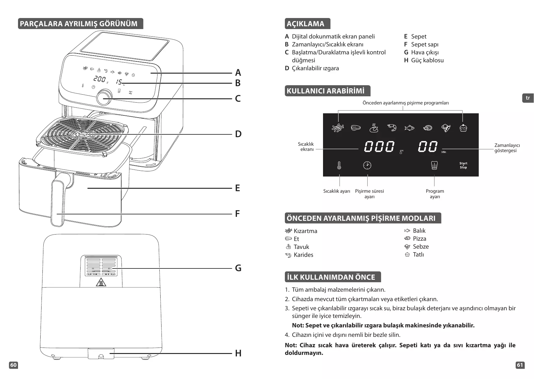 2. Retirez délicatement le tiroir de cuisson avec sa grille amovible de l’appareil. 3. Placez les aliments dans le tiroir de cuisson. • Remarque : ne dépassez jamais la quantité maximale indiquée dans le tableau (voir la section « Guide de cuisson »), car cela pourrait altérer la qualité du résultat final. 4. Replacez le tiroir de cuisson dans l’appareil. • Attention : ne touchez pas le tiroir de cuisson pendant l’utilisation et pendant un certain temps après utilisation, car il devient très chaud. Tenez le tiroir de cuisson par la poignée uniquement. 5. Appuyez sur pour allumer l’appareil. L’écran affiche le programme « Manuel » par défaut : 200°C / 15 minutes. Le bouton clignote. 6. Vous pouvez maintenant choisir entre le mode de cuisson prédéfini et le réglage manuel. a. Si vous choisissez le mode de cuisson prédéfini : • Appuyez sur le bouton Le mode Frites se met à clignoter. • Sélectionnez le mode de cuisson souhaité en tournant le bouton de contrôle (ces modes sont décrits en détail dans la section « Guide de cuisson »). • Si vous devez régler la température : appuyez sur le bouton puis utilisez le bouton de contrôle pour régler la température. Plage de contrôle : min. 80°C, max. 200°C. Une fois la sélection effectuée, la température clignote pendant 6 secondes avant d’être réglée. • S i vous devez régler le minuteur : appuyez sur le bouton puis utilisez le bouton de contrôle pour régler le temps. Plage de contrôle : min. 1 minute, max. 60 minutes. Une fois votre sélection effectuée, le minuteur clignote pendant 6 secondes avant d’être réglé. • Si vous devez régler la température : appuyez sur le bouton puis utilisez le bouton de contrôle pour régler la température. Plage de contrôle : min. 80°C, max. 200°C. Une fois la sélection effectuée, la température clignote pendant 6 secondes avant d’être réglée. • Si vous devez régler le minuteur : appuyez sur le bouton puis utilisez le bouton de contrôle pour régler le temps. Plage de contrôle : min. 1 minute, max. 60 minutes. Une fois votre sélection effectuée, le minuteur clignote pendant 6 secondes avant d’être réglé. 7. Pour revenir au programme « Manuel » par défaut, appuyez simplement de nouveau sur le bouton . 8. Validez le mode de cuisson en appuyant sur le bouton Cela lance votre cuisson. La cuisson se met en route. Le temps de cuisson restant s’affiche à l’écran. 9. Certains aliments nécessiteront d’être brassés en milieu de cuisson pour un résultat de cuisson optimal (voir la section « Guide de cuisson »). Pour brasser les aliments, appuyez sur le centre du bouton de contrôle ou sur le bouton pour interrompre la cuisson. Retirez le tiroir de cuisson hors de l’appareil par la poignée et secouez-le. Replacez le tiroir de cuisson dans l’appareil, puis appuyez de nouveau sur le centre du bouton de contrôle ou sur le bouton pour reprendre la cuisson. • Astuce : vous pouvez régler le minuteur sur la moitié du temps de cuisson. Lorsque le minuteur retentit, brassez les ingrédients. Réglez ensuite à nouveau le minuteur sur le temps de cuisson restant. • Remarque : lorsque le tiroir de cuisson est retiré, l’appareil passe en mode Pause. Pour que la cuisson reprenne, le tiroir de cuisson doit être replacé dans l’appareil dans les 10 minutes. Si le tiroir de cuisson n’est pas replacé dans l’appareil dans les 10 minutes, le programme, la température et la durée doivent être reconfigurés. • Avertissement : s’il y a beaucoup d’aliments dans le tiroir de cuisson, celui-ci peut être lourd. Lorsque vous secouez le tiroir de cuisson, utilisez vos deux mains et un gant de cuisine pour éviter de vous brûler. 10. Lorsque le minuteur retentit, le temps de cuisson configuré est terminé. Retirez le tiroir de cuisson de l’appareil et posez-le sur une surface résistante à la chaleur. 11. Vérifiez que vos aliments sont prêts. Si vos aliments ne sont pas prêts, replacez simplement le tiroir de cuisson dans l’appareil et réglez le minuteur pour ajouter quelques minutes de cuisson supplémentaires. 12. Lorsque les aliments sont cuits, utilisez une pince non métallique (par exemple, une pince en silicone) pour retirer les aliments du tiroir de cuisson. L’excès d’huile de la nourriture est recueilli dans le fond du tiroir de cuisson. • Attention : ne retournez jamais le tiroir de cuisson, car la grille amovible et l’huile chaude pourraient tomber.