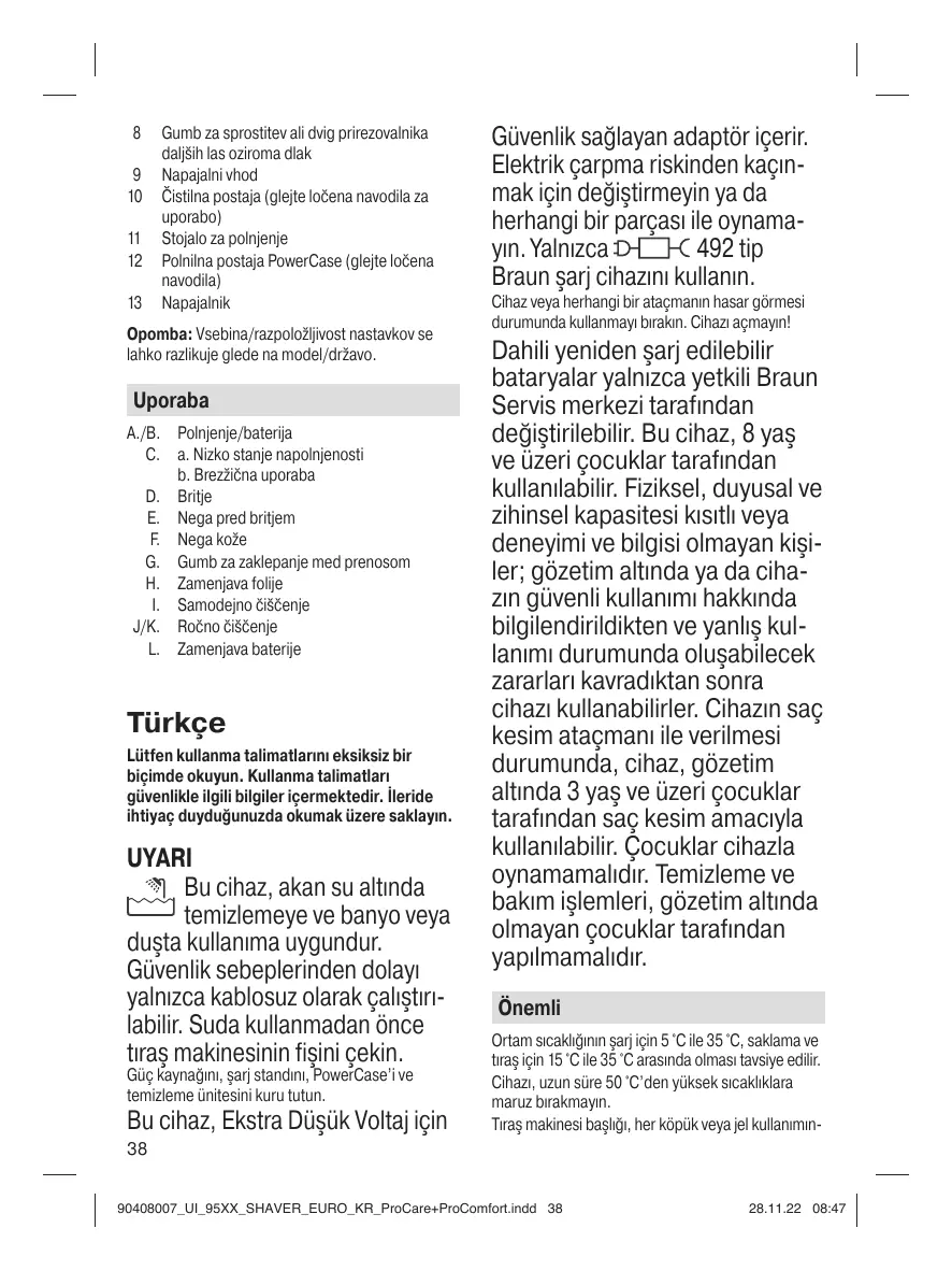 Güvenlik sağlayan adaptör içerir. Elektrik çarpma riskinden kaçınmak için değiştirmeyin ya da herhangi bir parçası ile oynamayın. Yalnızca 492 tip Braun şarj cihazını kullanın. Cihaz veya herhangi bir ataçmanın hasar görmesi durumunda kullanmayı bırakın. Cihazı açmayın!