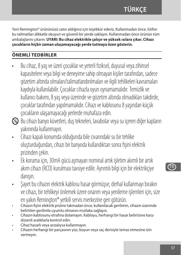 • Lorsque l’appareil est utilisé dans une salle de bains, débranchez-le après usage. La proximité de l’eau présente un danger même lorsque l’appareil est éteint. • Pour une protection supplémentaire, l’installation de courant résiduel (RCD) avec un differentiel residuel nominal ne dépassant pas 30mA est recommandée. Demandez de l’aide à un électricien. • Si le cordon d’alimentation de cet appareil est endommagé, cessez immédiatement d’utiliser l’appareil et renvoyez-le au service consommateurs Remington agréé le plus proche en vue de sa réparation ou de sa substitution afin d’éviter tout risque. • •
