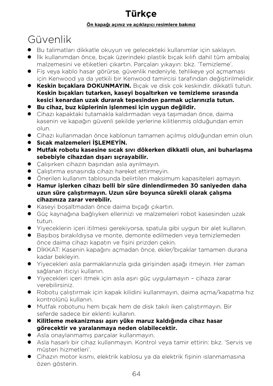 Si le cordon ou la prise sont endommagés, il faut les faire remplacer, pour des raisons de sécurité, par Kenwood ou un réparateur agréé par Kenwood pour éviter tout accident. NE TOUCHEZ PAS les lames, elles sont tranchantes. Le couteau et les disques sont très tranchants, à manipuler avec précaution. Tenez toujours les ustensiles et accessoires par la partie supérieure, loin des zones coupantes, lorsque vous les manipulez, que vous videz le bol ou pendant le nettoyage. Cet appareil ne permet pas de travailler avec des glaçons. Avant de soulever ou de porter l’appareil par la poignée du couvercle, vérifiez toujours que le bol et le couvercle sont bien solidement enclenchés. Vérifiez que le cordon est entièrement déroulé avant d’utiliser l’appareil. Veuillez NE PAS MIXER des ingrédients chauds. Faites attention si vous versez du liquide chaud dans le bol multifonction, car il peut être éjecté de l’appareil sous l’effet soudain de la vapeur. Ne laissez jamais l’appareil sans surveillance lorsqu’il fonctionne. Ne déplacez pas l’appareil pendant son fonctionnement. Ne dépassez pas les capacités maximales données dans le tableau des conseils d’utilisation. Ne faites pas fonctionner votre appareil pendant plus de 30 secondes sans pause lorsque vous travaillez une pâte. Si vous l’utilisez pendant de plus longues périodes, vous risquez d’endommager l’appareil. Veillez toujours à retirer la lame avant de verser le contenu du bol. Veillez à garder vos mains et tout ustensile hors du bol tant que l’appareil demeure branché. Si vous devez pousser des aliments, utilisez un ustensile approprié tel qu’une spatule. Éteignez toujours l’appareil et débranchez-le de l’alimentation lorsque vous devez le laisser sans surveillance et avant d’installer de retirer, ou de nettoyer les accessoires. ATTENTION : avant de retirer le couvercle du bol, attendez que l’accessoire/les lames soient complètement arrêtés. Ne poussez jamais la nourriture dans le tube d’alimentation avec les doigts. Utilisez toujours le poussoir fourni avec l’appareil. N’exercez pas de force excessive pour pousser la nourriture dans le tube d’alimentation , vous pourriez endommager votre appareil. N’utilisez pas le verrouillage du couvercle pour faire fonctionner le bol multifonction, utilisez toujours le bouton.