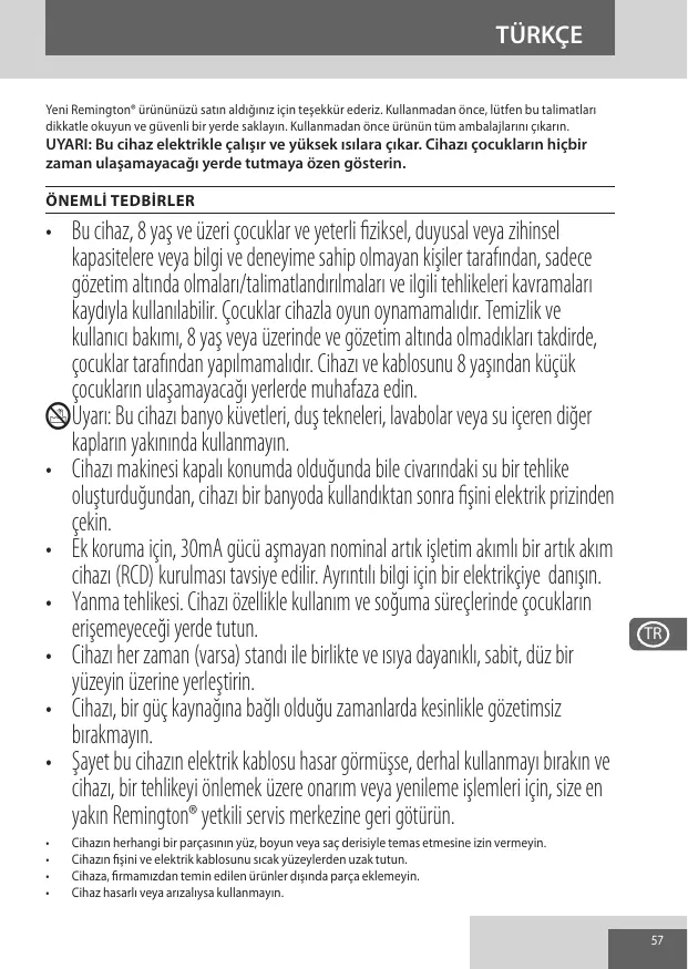 • Bu cihaz, 8 yaş ve üzeri çocuklar ve yeterli fiziksel, duyusal veya zihinsel kapasitelere veya bilgi ve deneyime sahip olmayan kişiler tarafından, sadece gözetim altında olmaları/talimatlandırılmaları ve ilgili tehlikeleri kavramaları kaydıyla kullanılabilir. Çocuklar cihazla oyun oynamamalıdır. Temizlik ve kullanıcı bakımı, 8 yaş veya üzerinde ve gözetim altında olmadıkları takdirde, çocuklar tarafından yapılmamalıdır. Cihazı ve kablosunu 8 yaşından küçük çocukların ulaşamayacağı yerlerde muhafaza edin. L Uyarı: Bu cihazı banyo küvetleri, duş tekneleri, lavabolar veya su içeren diğer kapların yakınında kullanmayın. • Cihazı makinesi kapalı konumda olduğunda bile civarındaki su bir tehlike oluşturduğundan, cihazı bir banyoda kullandıktan sonra fişini elektrik prizinden çekin. • Ek koruma için, 30mA gücü aşmayan nominal artık işletim akımlı bir artık akım cihazı (RCD) kurulması tavsiye edilir. Ayrıntılı bilgi için bir elektrikçiye danışın. • Yanma tehlikesi. Cihazı özellikle kullanım ve soğuma süreçlerinde çocukların erişemeyeceği yerde tutun. • Cihazı her zaman (varsa) standı ile birlikte ve ısıya dayanıklı, sabit, düz bir yüzeyin üzerine yerleştirin. • Cihazı, bir güç kaynağına bağlı olduğu zamanlarda kesinlikle gözetimsiz bırakmayın. • Şayet bu cihazın elektrik kablosu hasar görmüşse, derhal kullanmayı bırakın ve cihazı, bir tehlikeyi önlemek üzere onarım veya yenileme işlemleri için, size en yakın Remington® yetkili servis merkezine geri götürün. • • • •