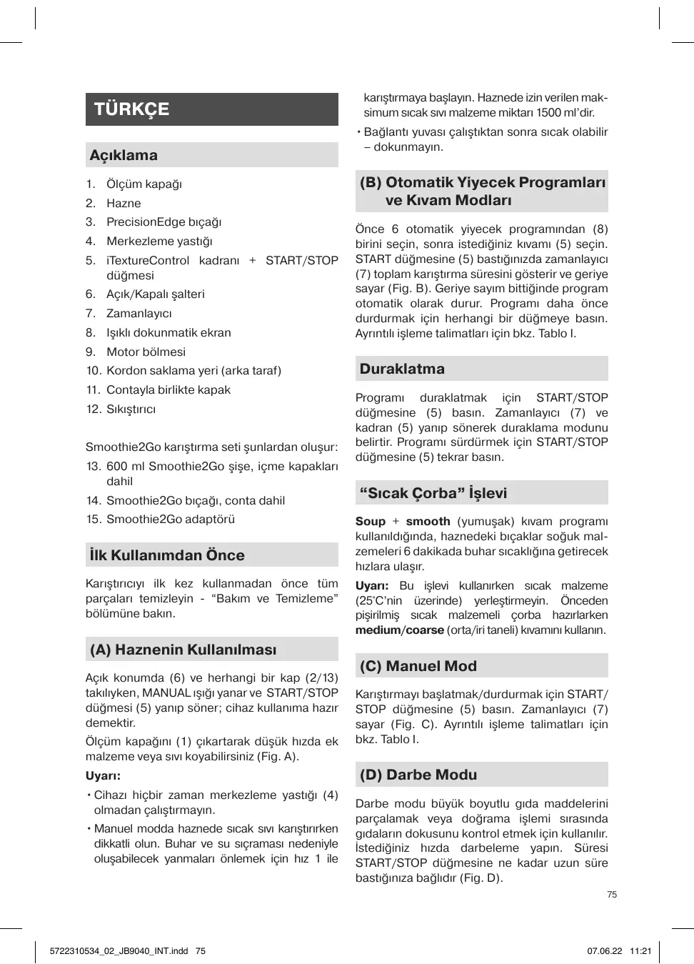 Automatiques et Modes de Texture Tout d‘abord, sélectionnez l’un des six programmes alimentaires automatiques (8) puis sélectionnez la texture (5) de votre choix pour obtenir votre consistance préférée. Après avoir appuyé sur START (5), le minuteur (7) affiche le temps de mixage total et effectue un compte à rebours (Fig. B). Le programme s‘arrête automatiquement à la fin du compte à rebours. Pour arrêter le programme avant la fin, appuyez sur n’importe quel bouton. Pour les instructions de fonctionnement détaillées voir le tableau I.