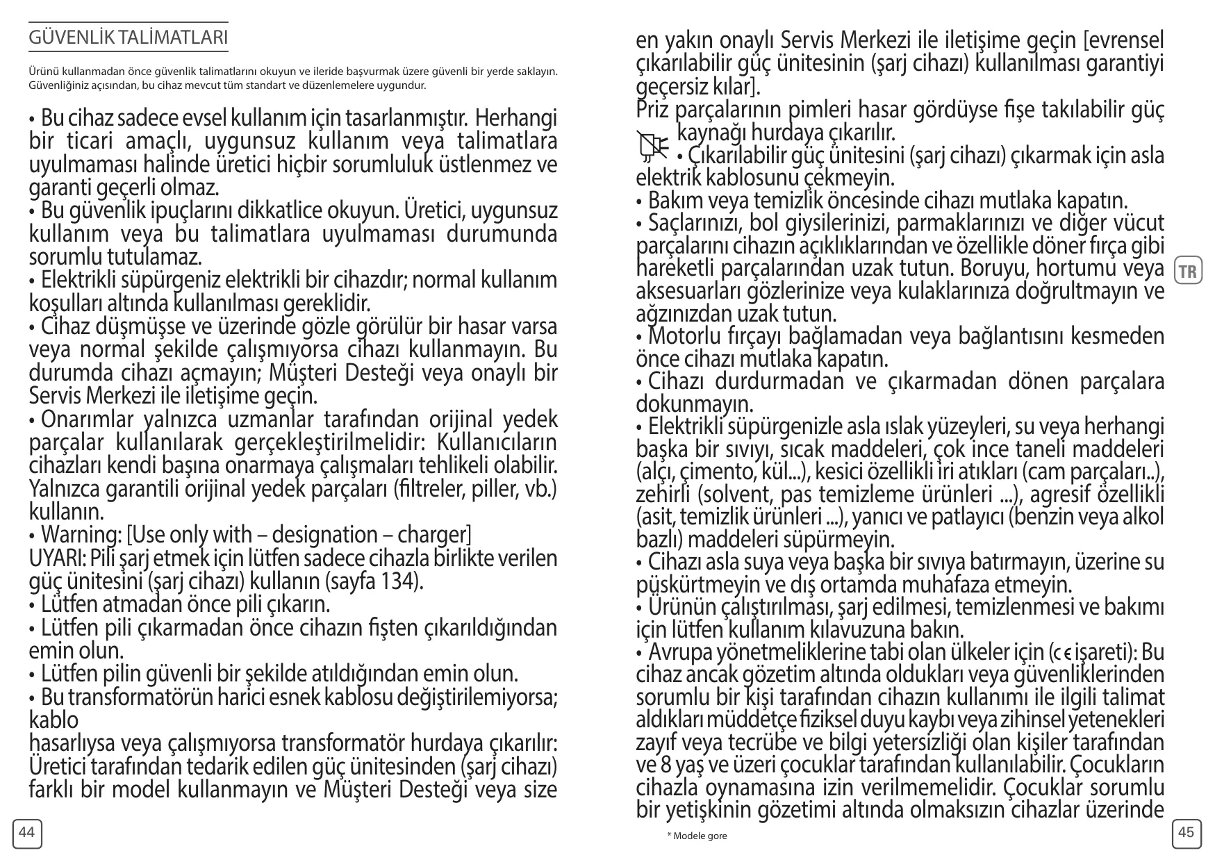 • Lisez attentivement ces conseils de sécurité. Une utilisation non appropriée ou non conforme au mode d’emploi dégagerait la marque de toute responsabilité. • Votre aspirateur est un appareil électrique : il doit être utilisé dans des conditions normales d’utilisation. • Ne pas utiliser l’appareil s’il est tombé et présente des détériorations visibles ou des anomalies de fonctionnement. Dans ce cas ne pas ouvrir l’appareil, mais l’envoyer au Centre Services agréés le plus proche de votre domicile, car des outils spéciaux sont nécessaires pour effectuer toute réparation afin d’éviter un danger. • Les réparations ne doivent être effectuées que par des spécialistes avec des pièces détachées d’origine : réparer un appareil soi-même peut constituer un danger pour l’utilisateur. N’utiliser que des accessoires garantis d’origine (filtres, batteries...). • Warning: [Use only with – designation – charger] MISE EN GARDE : Pour le rechargement de la batterie, utiliser uniquement l’unité d’alimentation amovible (chargeur) et sa fixation murale fournies avec l’appareil (page 134). • La batterie doit être retirée de l’appareil avant que celui-ci ne soit mis au rebus. • L’appareil doit être déconnecté du réseau d’alimentation lorsqu’on retire la batterie. • La batterie doit être éliminée de façon sûre. • Le câble ou le cordon flexible externe de ce transformateur ne peut être remplacé; si le cordon est endommagé ou ne fonctionne pas, le transformateur doit être mis au rebut : n’utilisez pas de bloc d’alimentation amovible (chargeur) autre que le modèle fourni par le fabricant et contactez le service clientèle ou votre centre de service agréé le plus proche (utilisation d’un bloc d’alimentation amovible universel ( chargeur) annule la garantie) 2