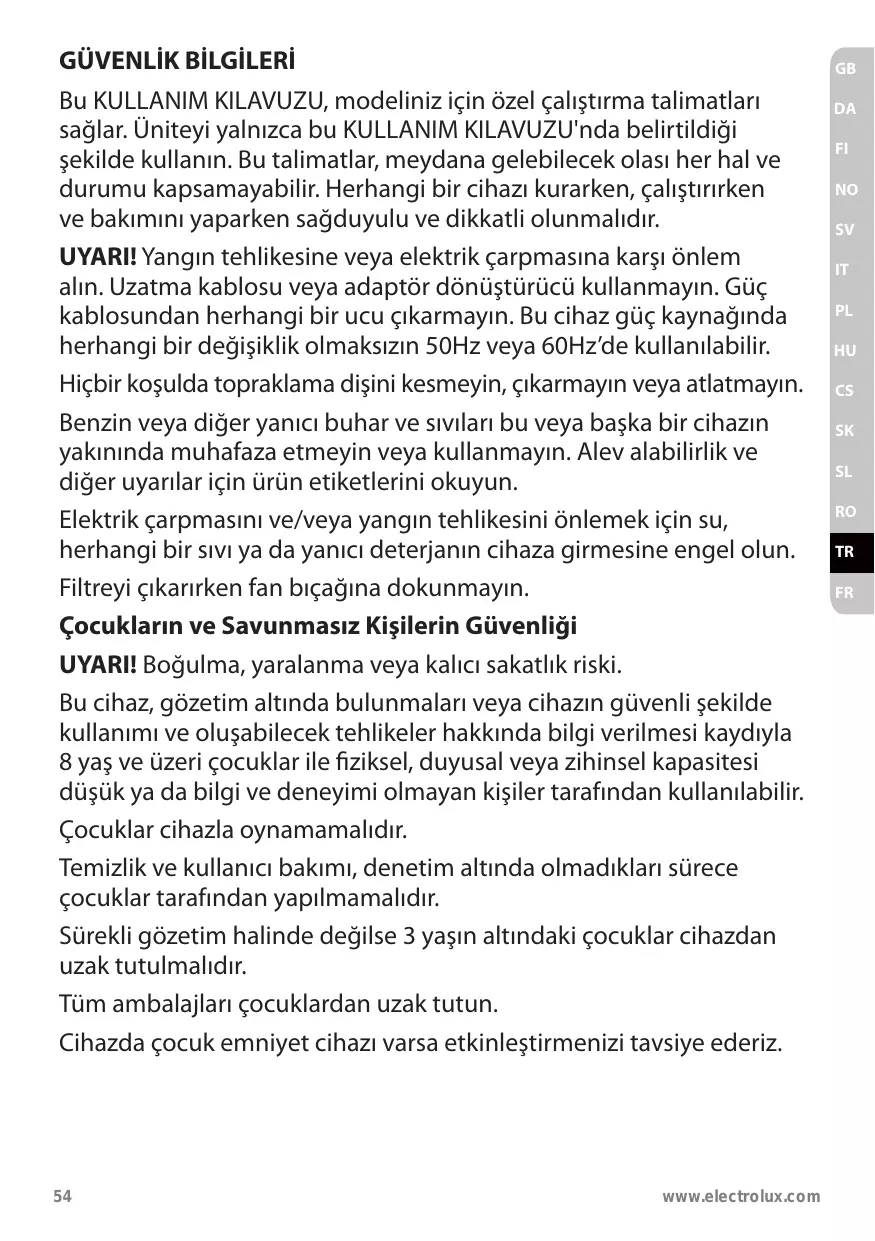 électrique. N'utilisez pas de rallonge ni de prise adaptateur. Ne retirez pas de broche du câble d'alimentation. Cet appareil peut être utilisé avec une alimentation électrique de 50 Hz ou 60 Hz sans être modifié. Il ne faut en aucun cas couper, enlever ou contourner la pince de mise à la terre. Ne stockez ou n'utilisez pas d'essence ou d'autres liquides ou vapeurs inflammables à proximité de cet appareil ou de tout autre appareil. Lisez les étiquettes produit relatives à la combustibilité ainsi que tous les autres avertissements. Ne laissez pas d’eau ou de détergent liquide ou inflammable entrer dans l’appareil pour éviter un choc électrique et/ou un risque d’incendie. Ne touchez pas la pale du ventilateur en retirant le filtre. Sécurité des enfants et des personnes vulnérables AVERTISSEMENT ! Risque d'asphyxie, de blessure ou d'invalidité permanente. Cet appareil peut être utilisé par des enfants à partir de 8 ans et par des personnes ayant des capacités physiques, sensorielles ou mentales réduites ou un manque d'expérience et de connaissances à condition d'être surveillées, d'avoir reçu des instructions concernant l'utilisation de l'appareil en toute sécurité et de comprendre les dangers encourus. Les enfants ne doivent pas jouer avec cet appareil. Les enfants ne doivent pas nettoyer ni entreprendre une opération de maintenance sur l'appareil sans surveillance. Les enfants de moins de 3 ans doivent être tenus à l'écart de l'appareil, à moins d'être surveillés en permanence. Ne laissez pas les emballages à portée de main des enfants. Si l’appareil dispose d’un dispositif de sécurité pour enfants, nous vous recommandons de l’activer. 58
