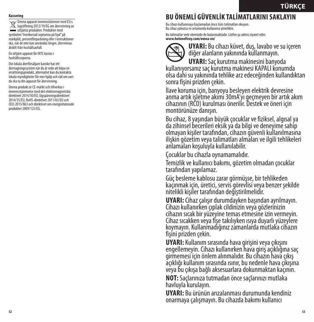 UYARI: Bu cihazi kuvet, duş, lavabo ve su iceren diger alanlarin yakininda kullanmayin.