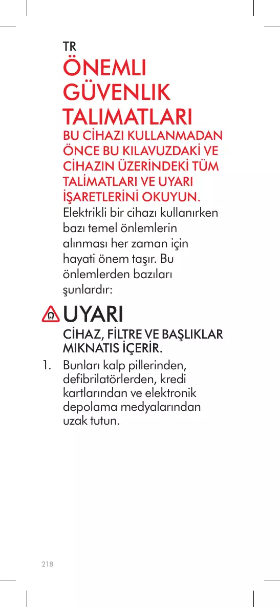 AVERTISSEMENT L’APPAREIL, LE FILTRE ET LES ACCESSOIRES CONTIENNENT DES AIMANTS. 1. Tenez l’appareil éloigné des stimulateurs cardiaques, des défibrillateurs, des cartes de crédit et des supports de stockage électroniques.
