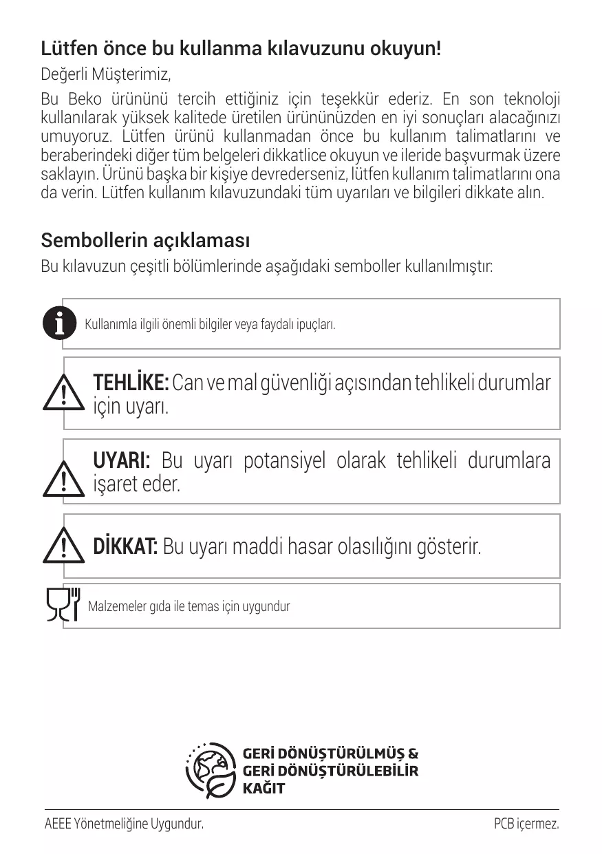 La machine à café expresso manuelle Beko est destinée à être utilisée à domicile et dans des applications similaires, par exemple dans les cuisines du personnel, les magasins, les bureaux et autres lieux similaires ou par les clients des chambres d’hôtes, des hôtels, des motels et autres lieux d'habitation. Cette machine à café n'est pas destinée à un usage commercial. La machine est uniquement destinée à la préparation du café et au chauffage du lait et de l'eau. Toute autre utilisation que celle indiquée précédemment est considérée comme une utilisation abusive. onsignes importantes sur la sécurité et 1 C l'environnement