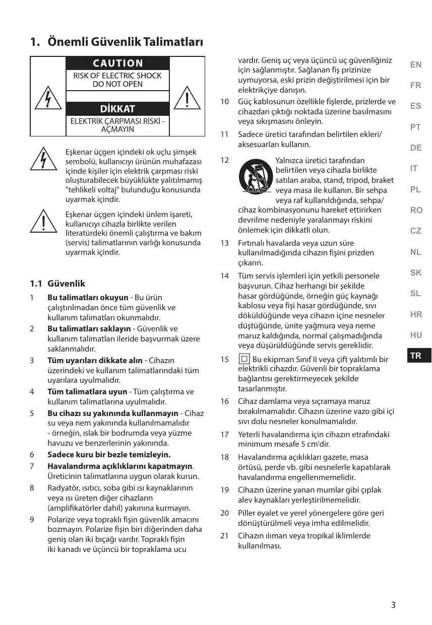 Utilisez uniquement un chariot, socle, trépied, support ou table spécifiés par le fabricant ou vendu avec l’appareil. Lorsqu’un chariot ou rack est utilisé, soyez prudent quand vous déplacez l’ensemble chariot/appareil de manière à éviter les blessures en cas de chute. Débranchez l’appareil en cas d’orage ou lorsqu’il est inutilisé pendant de longues périodes. Confiez toute réparation à un personnel qualifié. Une réparation est nécessaire lorsque l’appareil a été endommagé d’une manière ou d’une autre, tels que lorsque le cordon d’alimentation ou la fiche sont endommagés, du liquide a été renversé, des objets sont tombés à l’intérieur, l’appareil a été exposé à la pluie ou à l’humidité, qu’il ne fonctionne pas correctement ou qu’il est tombé. Cette unité est un appareil électrique à double isolation de Classe II. Il a été conçu de telle sorte qu'il ne nécessite pas une connexion à la terre pour la sécurité électrique. L’appareil ne doit pas être exposé à des égouttements ou des éclaboussures. Aucun objet rempli de liquide, tel qu’un vase, ne doit être placé sur l’appareil. La distance minimale autour de l’appareil pour une ventilation suffisante est de 5 cm. Ne pas entraver la ventilation en recouvrant les ouvertures de ventilation avec des objets tels que journaux, nappes de table, rideaux, etc. Ne pas placer de sources de flammes nues, comme des chandelles, sur le produit. Les piles doivent être recyclées ou mises au rebut conformément aux directives nationales et locales. Utiliser l’appareil dans des climats tempérés ou tropicaux.