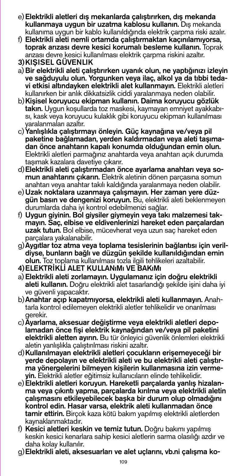 g)Utilisez l'outil électroportatif, les accessoires, les forets, etc. conformément à ces instructions en tenant compte des conditions de travail et du travail à effectuer. L'utilisation des outils électroportatifs à d'autres fins que celles prévues peut créer des situations dangereuses.