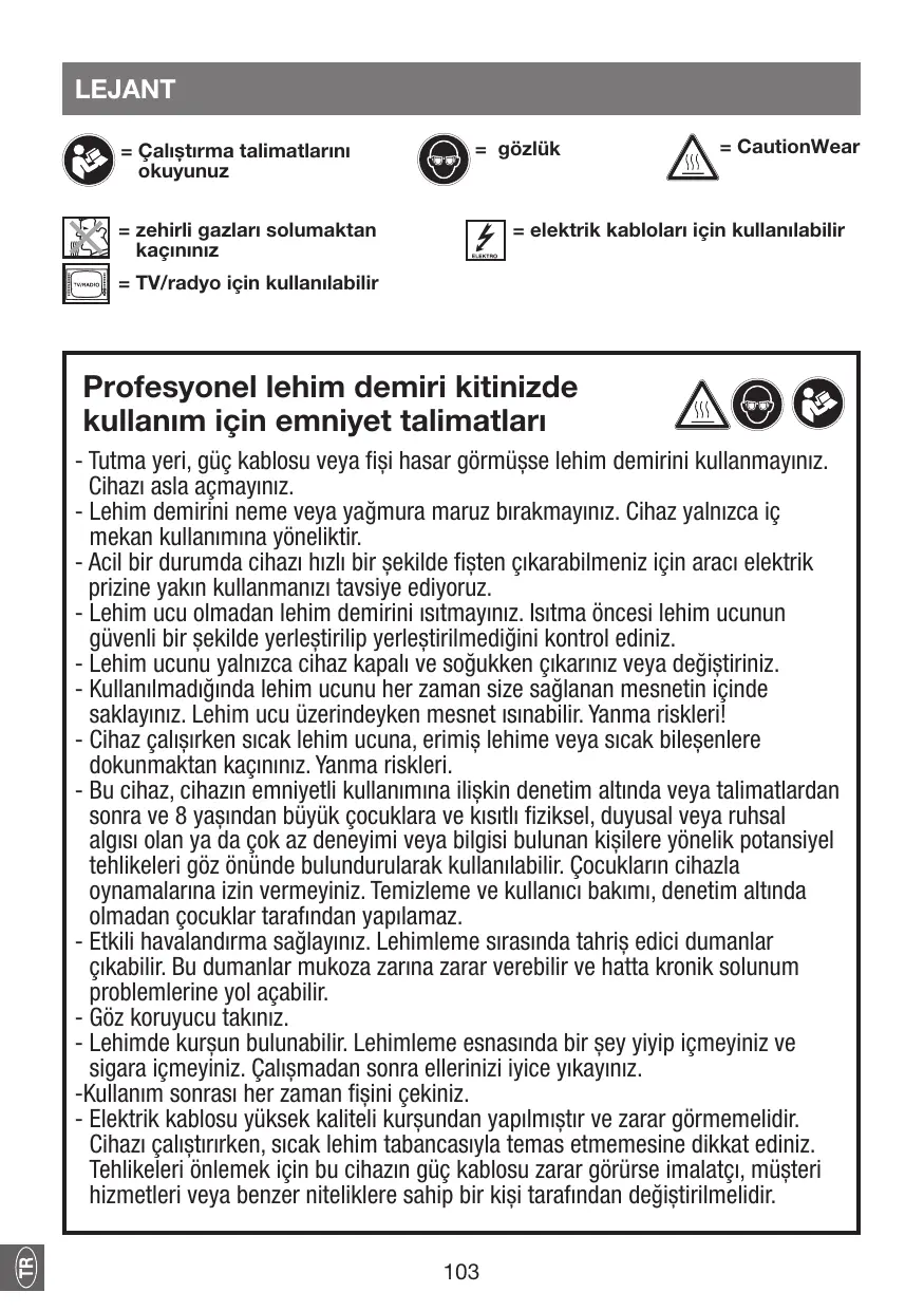 KULLANIM AMACI Lehim demiri, ôneÿin kablolan ve devre kartlarini lehimlemek için tasarlanmistir. Yalniz bu amaçlar için kullanilabilir. Bunlarin disindaki kullanimlar agçikça yasaktir ve kullanim amaci olarak uygulanamaz.