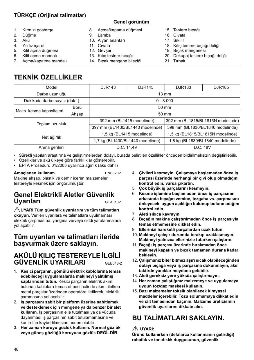 Designaciôn de la mâquina: Sierra Reciproca Inalämbrica N° de modelo/Tipo: DJR143, DJR145, DJR183, DJR185 son de producciôn serie y Cumplen con las siguientes Directivas europeas: 2006/42/CE Y se han fabricado de acuerdo con los siguientes. eständares o documentos estandarizados: en