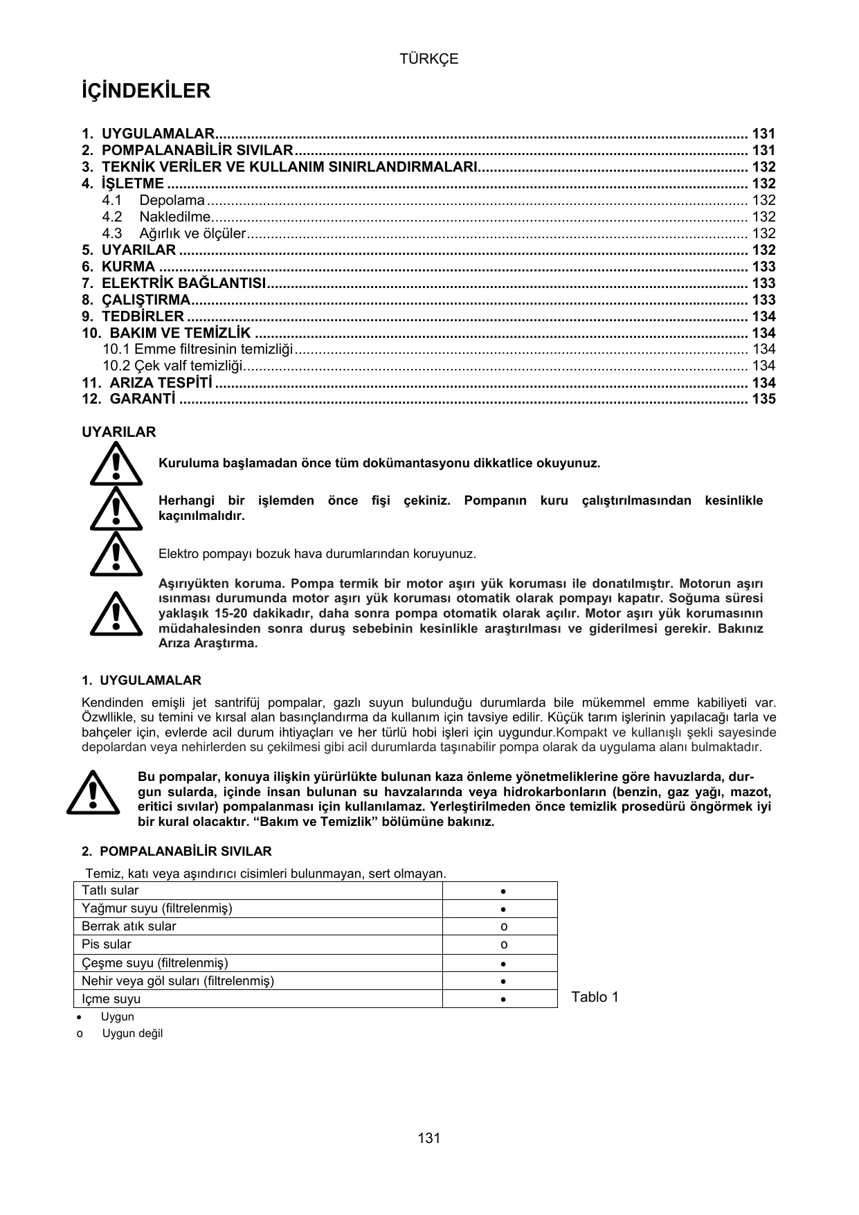 gun sularda, içinde insan bulunan su havzalarinda veya hidrokarbonlarin (benzin, gaz yaÿi, mazot, eritici sivilar) pompalanmasi için kullanilamaz. Yerlestirilmeden ônce temizlik prosedürü ôngôrmek iyi bir kural olacaktir. “Bakim ve Temizlik” bôlümüne bakiniz.