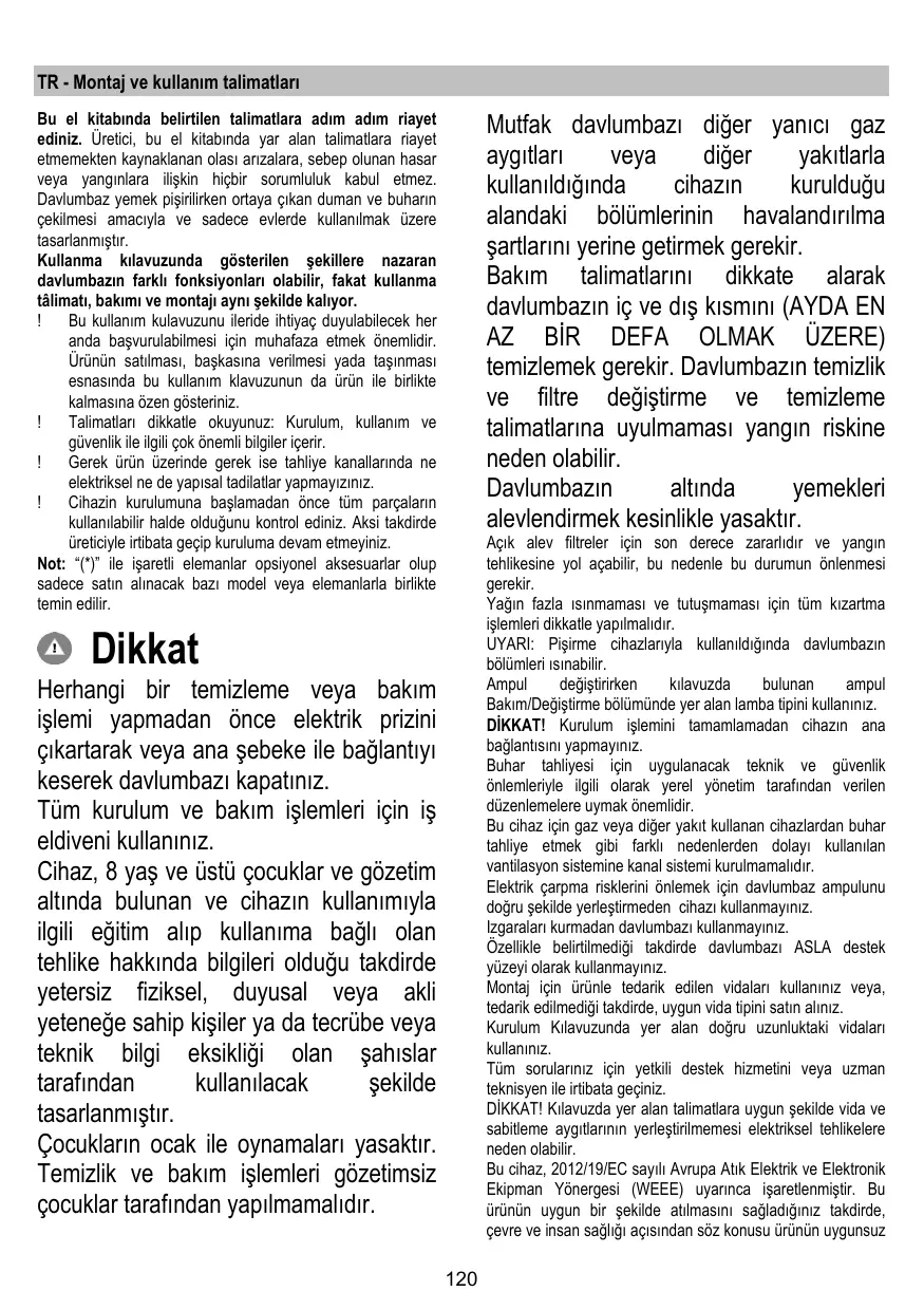 La hotte ne doit JAMAIS être uillsée comme une surface d'appui, sauf indication expresse.