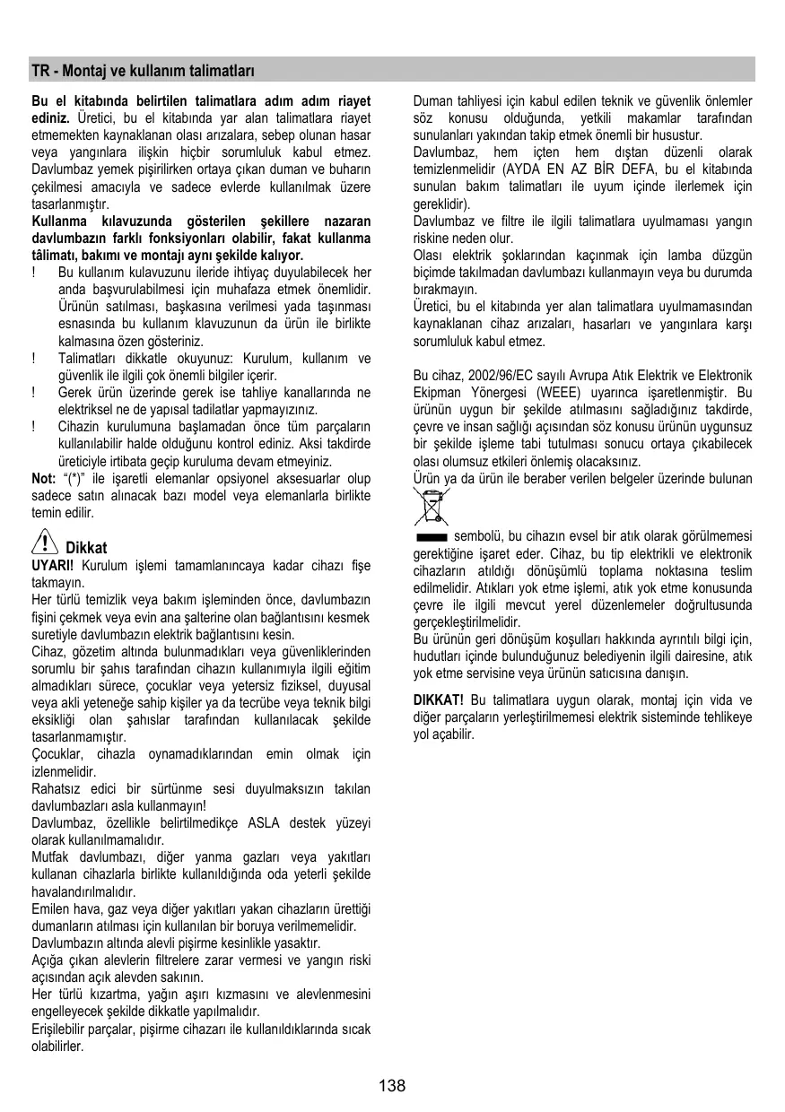 En ce qui conceme les mesures techniques et de sécurité à adopter pour l'évacuation des fumées, s'en tenir strictement à ce qui est prévu dans les règlements des autorités locales compétentes. La hotte doit être régulièrement nettoyée, aussi bien à l'intérieur qu'à l'extérieur (AU MOINS UNE FOIS PAR MOIS, respecter néanmoins les instructions relatives à l'entretien fournies dans ce manuel).
