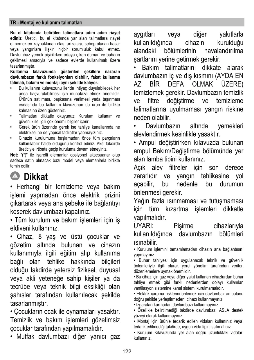 + La hotte ne doit JAMAIS être utilisée comme une surface d'appui, sauf indication expresse.