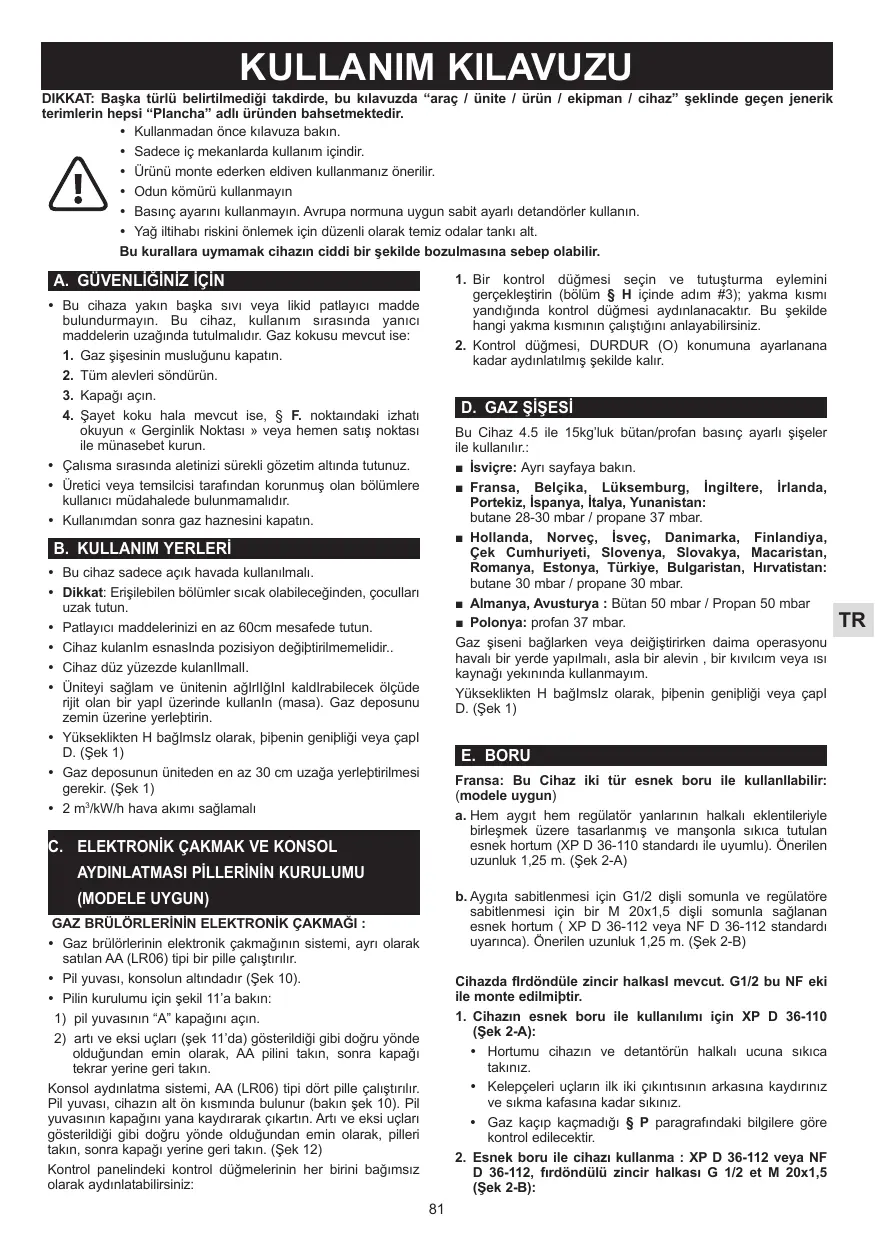 D. BOUTEILLE DE GAZ Cet appareil est réglé pour fonctionner avec les