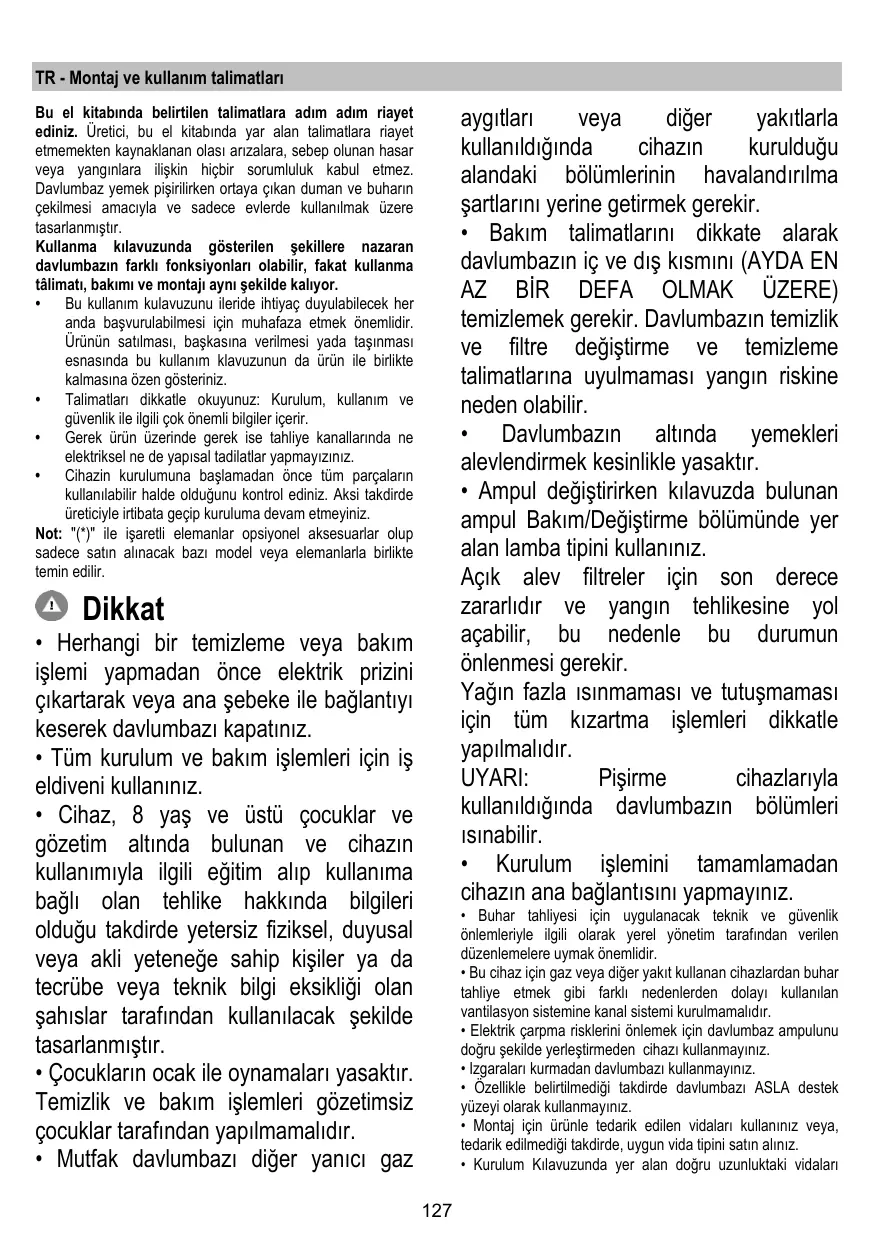 + La hotte ne doit JAMAIS être utilisée comme une surface d'appui, sauf indication expresse.
