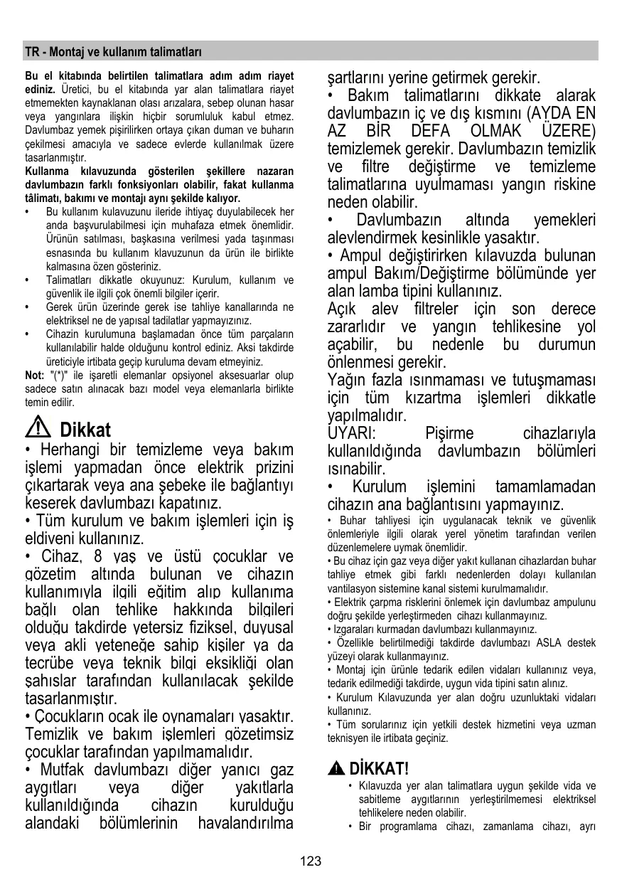 kullanildiÿimda davlumbazin bôlümleri isinabilir. + Kurulum islemini tamamlamadan