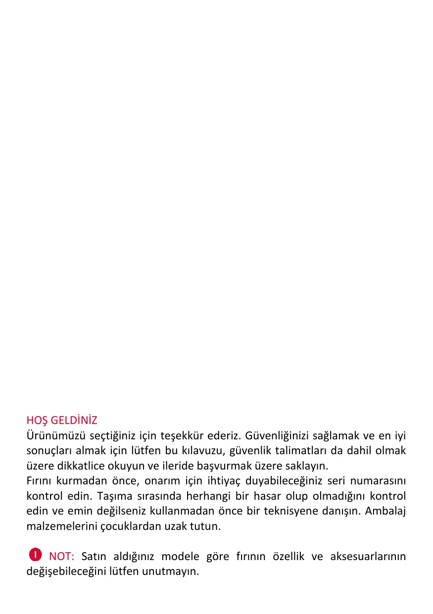 GENEL UYARILAR Temizlik islemlerinde buharli temizleyici kullanmayin. Kullanim sirasinda cihaz isinir. Firinin içindeki isitma elemanlarina do- kunmamaya ôzen gôsterilmelidir.