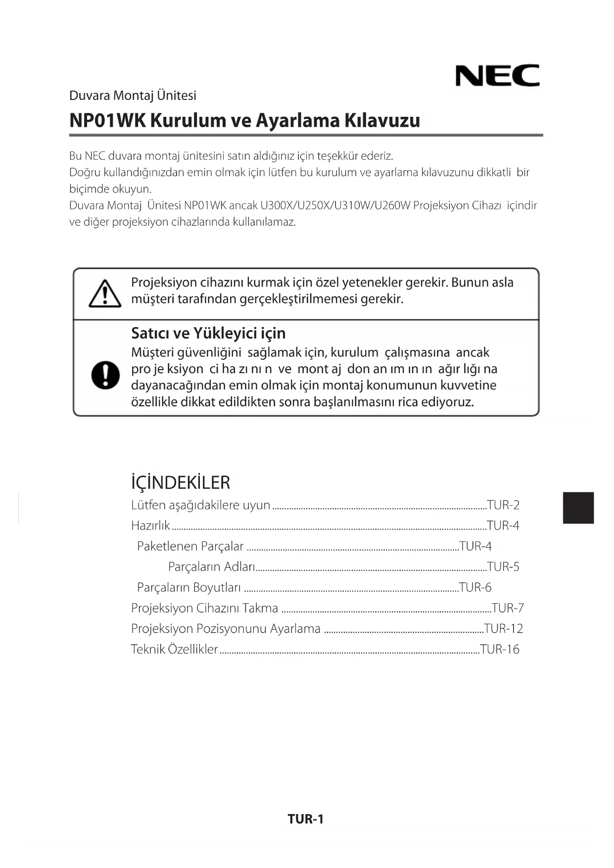 - Технические характеристики и дизайн устройства могут изменяться без уведомления.TUR-1 Duvara Montaj Ünitesi NP01WK Kurulum ve Ayarlama Kılavuzu Bu NEC duvara montaj ünitesini satın aldığınız için teşekkür ederiz. Doğru kullandığınızdan emin olmak için lütfen bu kurulum ve ayarlama kılavuzunu dikkatli bir biçimde okuyun. Duvara Montaj Ünitesi NP01WK ancak U300X/U250X/U310W/U260W Projeksiyon Cihazı içindir ve diğer projeksiyon cihazlarında kullanılamaz. Projeksiyon cihazını kurmak için özel yetenekler gerekir. Bunun asla müşteri tarafından gerçekleştirilmemesi gerekir. Satıcı ve Yükleyici için Müşteri güvenliğini sağlamak için, kurulum çalışmasına ancak pro je ksiyon ci ha zı nı n ve mont aj don an ım ın ın ağır lığı na dayanacağından emin olmak için montaj konumunun kuvvetine özellikle dikkat edildikten sonra başlanılmasını rica ediyoruz. İÇİNDEKİLER Lütfen aşağıdakilere uyun ..........................................................................................TUR-2 Hazırlık ....................................................................................................................................TUR-4 Paketlenen Parçalar .........................................................................................TUR-4 Parçaların Adları .................................................................................................TUR-5 Parçaların Boyutları ..........................................................................................TUR-6 Projeksiyon Cihazını Takma ........................................................................................TUR-7 Projeksiyon Pozisyonunu Ayarlama ...................................................................TUR-12 Teknik Özellikler .............................................................................................................TUR-16TUR-2 TUR-3 Lütfen aşağıdakilere uyun