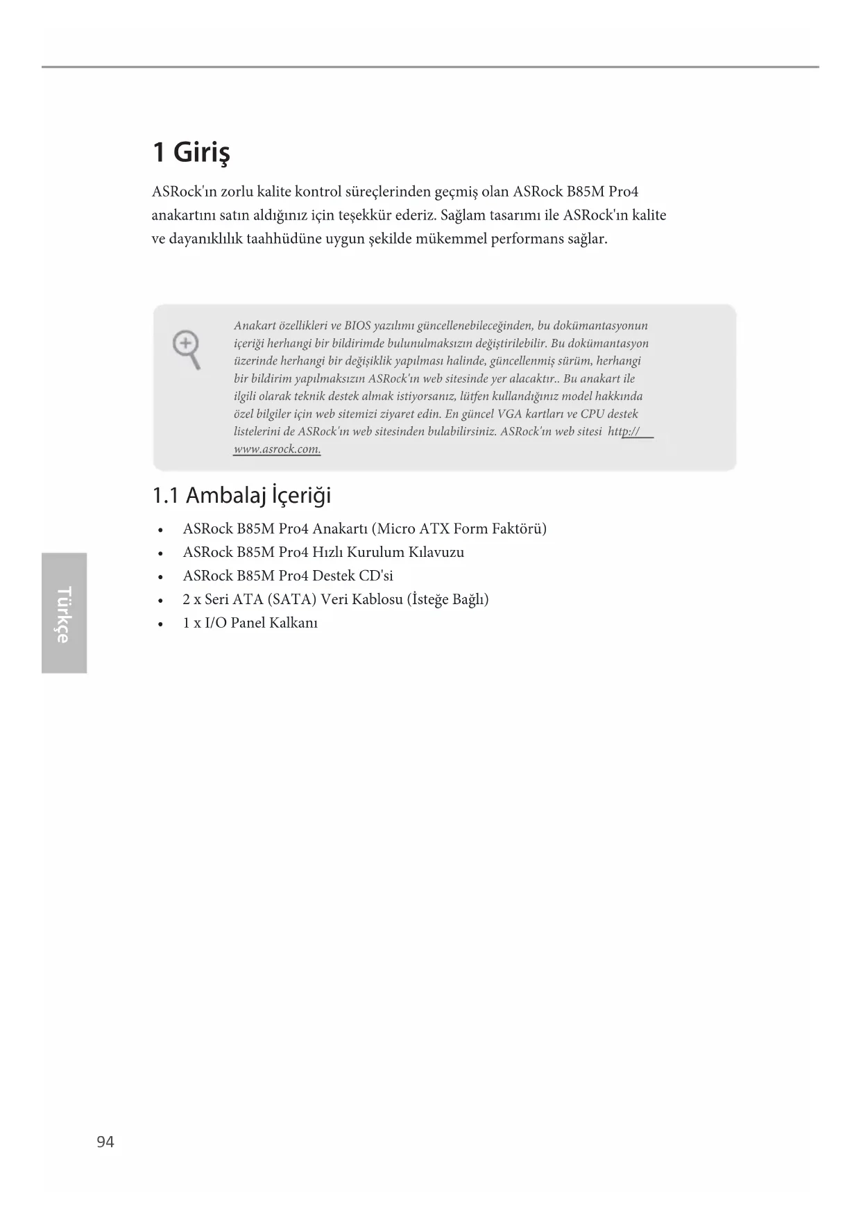 - 1 x I/O Panel Kalkanı Anakart özellikleri ve BIOS yazılımı güncellenebileceğinden, bu dokümantasyonun içeriği herhangi bir bildirimde bulunulmaksızın değiştirilebilir. Bu dokümantasyon üzerinde herhangi bir değişiklik yapılması halinde, güncellenmiş sürüm, herhangi bir bildirim yapılmaksızın ASRock'ın web sitesinde yer alacaktır.. Bu anakart ile ilgili olarak teknik destek almak istiyorsanız, lütfen kullandığınız model hakkında özel bilgiler için web sitemizi ziyaret edin. En güncel VGA kartları ve CPU destek listelerini de ASRock'ın web sitesinden bulabilirsiniz. ASRock'ın web sitesi http://www.asrock.com.B85M Pro4
