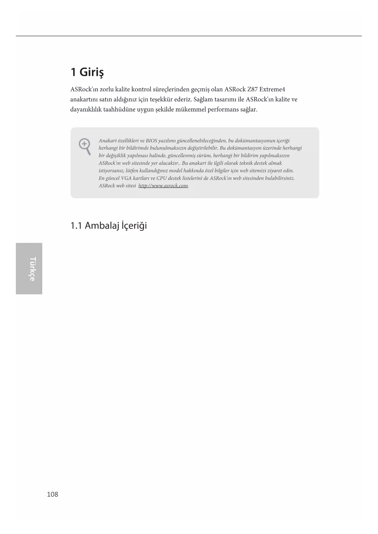 - 1 x ASRock SLI_Bridge_2S Kartı Anakart özellikleri ve BIOS yazılımı güncellenebileceğinden, bu dokümantasyonun içeriği herhangi bir bildirimde bulunulmaksızın değiştirilebilir. Bu dokümantasyon üzerinde herhangi bir değişiklik yapılması halinde, güncellenmiş sürüm, herhangi bir bildirim yapılmaksızın ASRock'ın web sitesinde yer alacaktır.. Bu anakart ile ilgili olarak teknik destek almak istiyorsanız, lütfen kullandığınız model hakkında özel bilgiler için web sitemizi ziyaret edin. En güncel VGA kartları ve CPU destek listelerini de ASRock'ın web sitesinden bulabilirsiniz. ASRock web sitesi http://www.asrock.com.109 Türkçe Z87 Extreme4