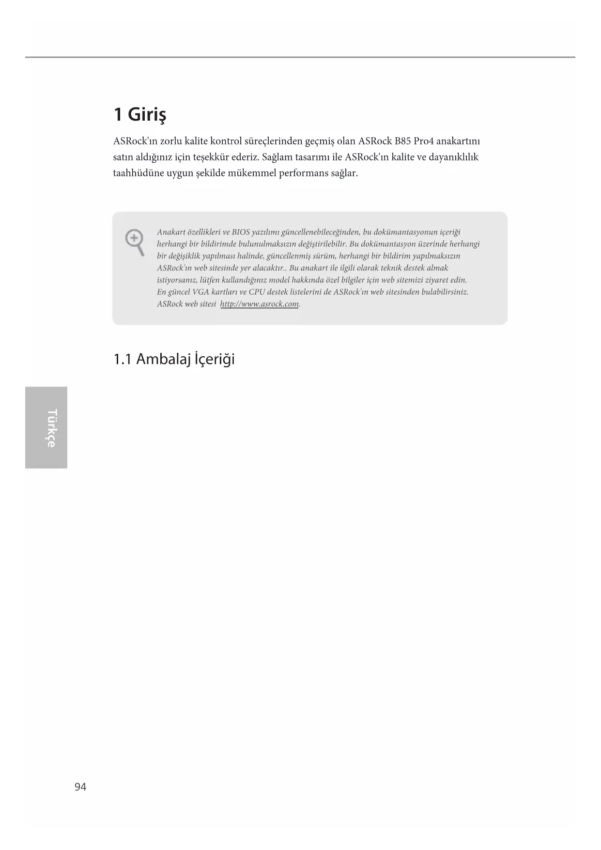 •1 x I/O Panel Kalkanı Anakart özellikleri ve BIOS yazılımı güncellenebileceğinden, bu dokümantasyonun içeriği herhangi bir bildirimde bulunulmaksızın değiştirilebilir. Bu dokümantasyon üzerinde herhangi bir değişiklik yapılması halinde, güncellenmiş sürüm, herhangi bir bildirim yapılmaksızın ASRock'ın web sitesinde yer alacaktır.. Bu anakart ile ilgili olarak teknik destek almak istiyorsanız, lütfen kullandığınız model hakkında özel bilgiler için web sitemizi ziyaret edin. En güncel VGA kartları ve CPU destek listelerini de ASRock'ın web sitesinden bulabilirsiniz. ASRock web sitesi http://www.asrock.com.B85 Pro4