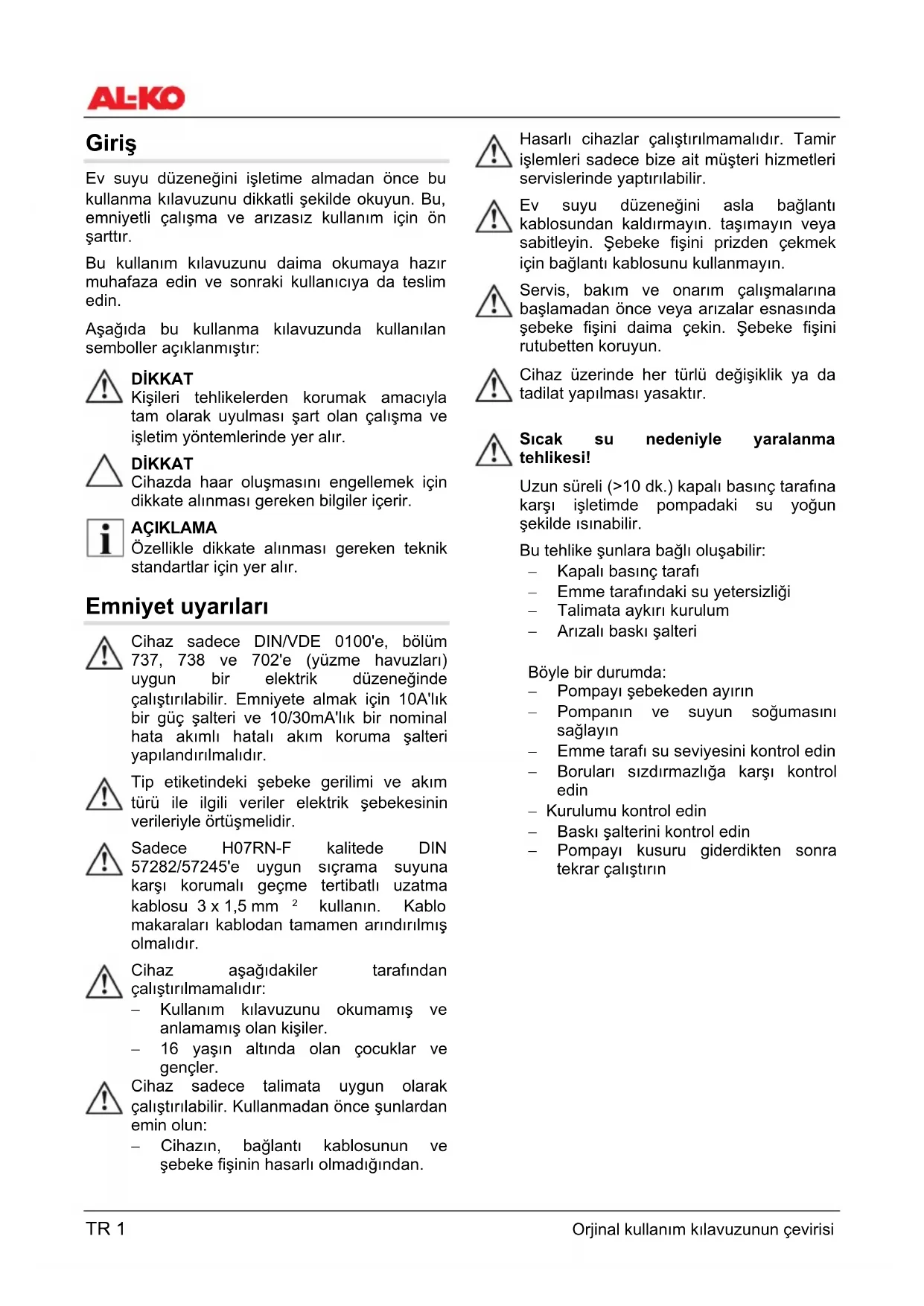 Sıcak su nedeniyle yaralanma tehlikesi! Uzun süreli (>10 dk.) kapalı basınç tarafına karşı işletimde pompadaki su yoğun şekilde ısınabilir. Bu tehlike şunlara bağlı oluşabilir: − Kapalı basınç tarafı − Emme tarafındaki su yetersizliği − Talimata aykırı kurulum − Arızalı baskı şalteri Böyle bir durumda: − Pompayı şebekeden ayırın − Pompanın ve suyun soğumasını sağlayın − Emme tarafı su seviyesini kontrol edin − Boruları sızdırmazlığa karşı kontrol edin − Kurulumu kontrol edin − Baskı şalterini kontrol edin − Pompayı kusuru giderdikten sonra tekrar çalıştırınOrjinal kullanım kılavuzunun çevirisi TR 2