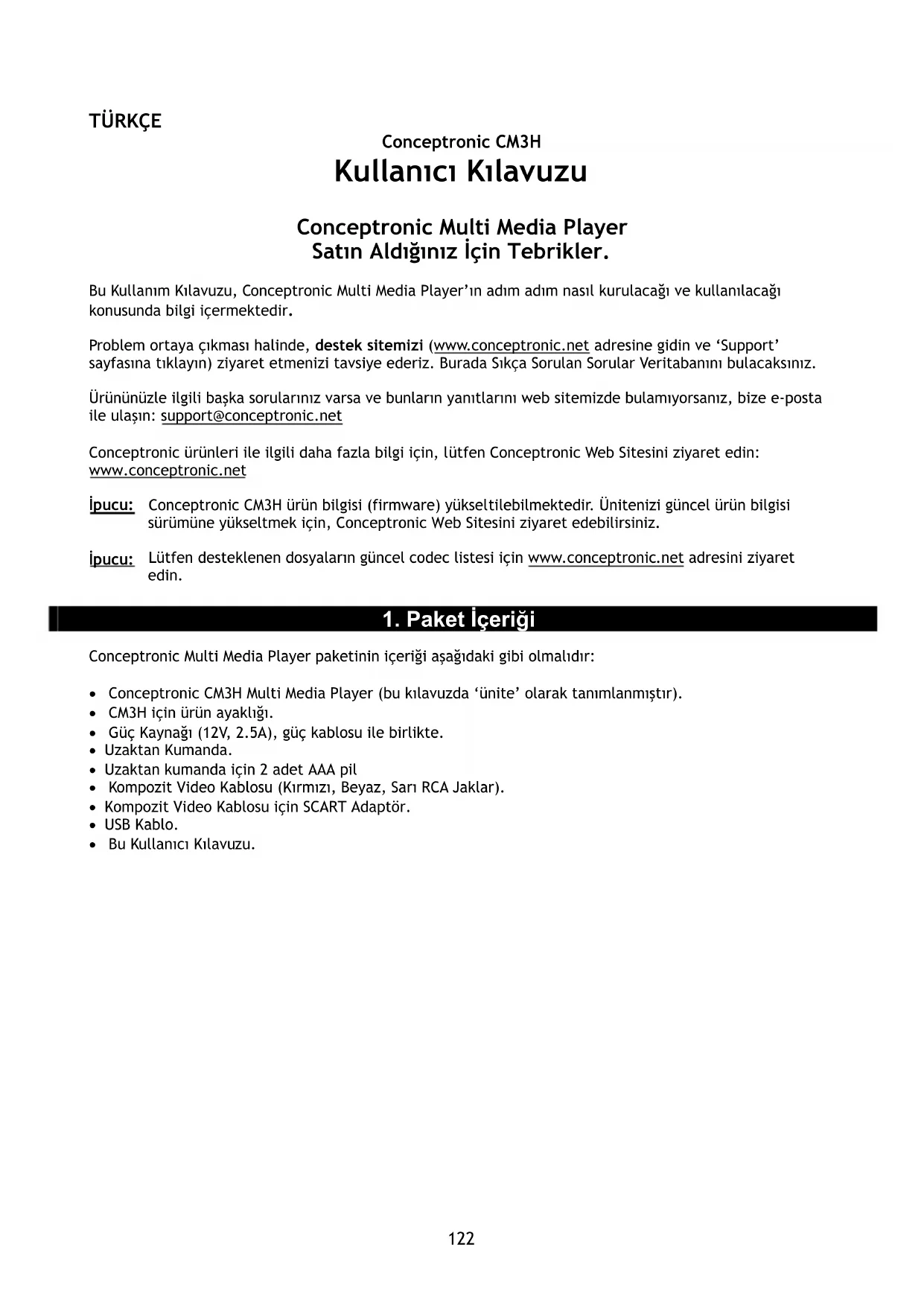Conceptronic Multi Media Player paketinin içeriği aşağıdaki gibi olmalıdır: