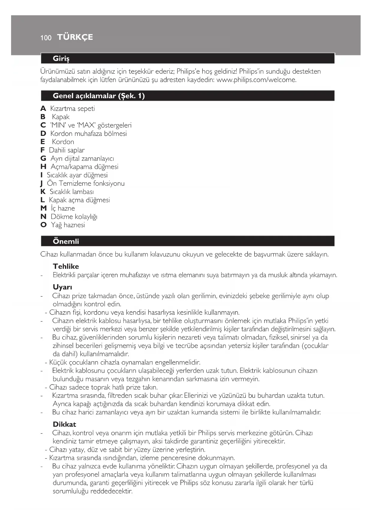 - Cihazın elektrik kablosu hasarlıysa, bir tehlike oluşturmasını önlemek için mutlaka Philips’in yetki