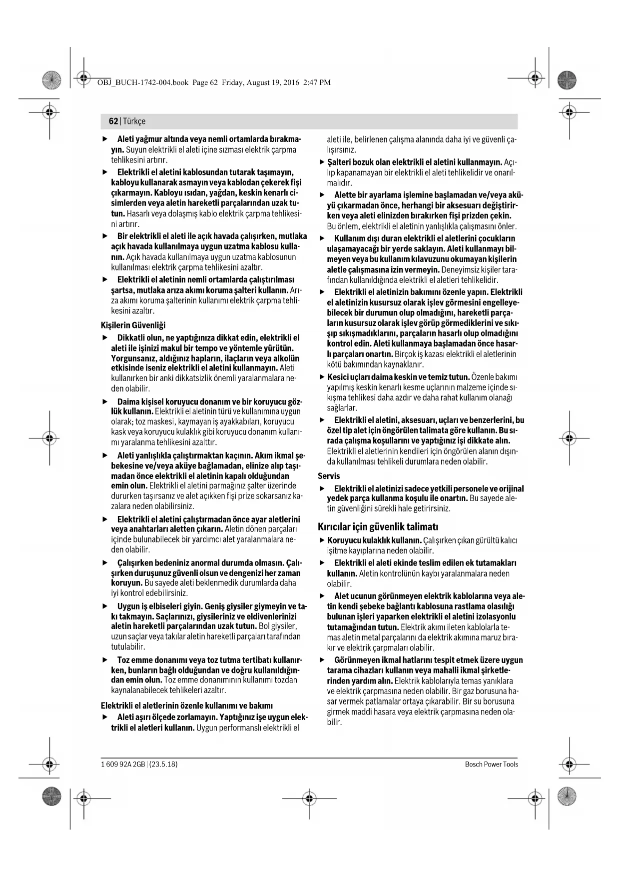 Μόνο για χώρες της ΕΕ: Σύμφωνα με την Κοινοτική Οδηγία 2012/19/EE σχετικά με τις παλαιές ηλεκτρι- κές και ηλεκτρονικές συσκευές και τη μετα- φορά της οδηγίας αυτής σε εθνικό δίκαιο δεν είναι πλέον υποχρεωτικό τα άχρηστα ηλεκτρι- κά εργαλεία να συλλέγονται ξεχωριστά για να ανακυκλωθούν με τρόπο φιλικό προς το περιβάλλον. Τηρούμε το δικαίωμα αλλαγών. Türkçe Güvenlik Talimatı Elektrikli El Aletleri İçin Genel Uyarı Talimatı Bütün uyarıları ve talimat hükümlerini oku- yun. Açıklanan uyarılara ve talimat hükümle- rine uyulmadığı takdirde elektrik çarpmalarına, yangınlara ve/veya ağır yaralanmalara neden olunabilir. Bütün uyarıları ve talimat hükümlerini ileride kullanmak üzere saklayın. Uyarı ve talimat hükümlerinde kullanılan “Elektrikli El Aleti” kavramı, akım şebekesine bağlı (şebeke bağlantı kablosu ile) aletlerle akü ile çalışan aletleri (akım şebekesine bağlantısı olmayan aletler) kapsamaktadır. Çalışma yeri güvenliği Çalıştığınız yeri temiz tutun ve iyi aydınlatın. Çalıştığınız yer düzensiz ise ve iyi aydınlatılmamışsa kazalar ortaya çı- kabilir. Yakınında patlayıcı maddeler, yanıcı sıvı, gaz veya toz- ların bulunduğu yerlerde elektrikli el aleti ile çalışma- yın. Elektrikli el aletleri, toz veya buharların tutuşmasına neden olabilecek kıvılcımlar çıkarırlar. Elektrikli el aleti ile çalışırken çocukları ve başkalarını uzakta tutun. Dikkatiniz dağılacak olursa aletin kontrolünü kaybedebilirsiniz. Elektrik Güvenliği Elektrikli el aletinin bağlantı fişi prize uymalıdır. Fişi hiçbir zaman değiştirmeyin. Koruyucu topraklanmış elektrikli el aletleri ile birlikte adaptör fiş kullanmayın. Değiştirilmemiş fiş ve uygun priz elektrik çarpma tehlikesi- ni azaltır. Borular, kalorifer petekleri, ısıtıcılar ve buzdolapları gi- bi topraklanmış yüzeylerle bedensel temasa gelmek- ten kaçının. Bedeniniz topraklandığı anda büyük bir elek- trik çarpma tehlikesi ortaya çıkar. UYARI OBJ_BUCH-1742-004.book Page 61 Friday, August 19, 2016 2:47 PM62 | Türkçe 1 609 92A 2GB | (23.5.18) Bosch Power Tools Aleti yağmur altında veya nemli ortamlarda bırakma- yın. Suyun elektrikli el aleti içine sızması elektrik çarpma tehlikesini artırır. Elektrikli el aletini kablosundan tutarak taşımayın, kabloyu kullanarak asmayın veya kablodan çekerek fişi çıkarmayın. Kabloyu ısıdan, yağdan, keskin kenarlı ci- simlerden veya aletin hareketli parçalarından uzak tu- tun. Hasarlı veya dolaşmış kablo elektrik çarpma tehlikesi- ni artırır. Bir elektrikli el aleti ile açık havada çalışırken, mutlaka açık havada kullanılmaya uygun uzatma kablosu kulla- nın. Açık havada kullanılmaya uygun uzatma kablosunun kullanılması elektrik çarpma tehlikesini azaltır. Elektrikli el aletinin nemli ortamlarda çalıştırılması şartsa, mutlaka arıza akımı koruma şalteri kullanın. Arı- za akımı koruma şalterinin kullanımı elektrik çarpma tehli- kesini azaltır. Kişilerin Güvenliği Dikkatli olun, ne yaptığınıza dikkat edin, elektrikli el aleti ile işinizi makul bir tempo ve yöntemle yürütün. Yorgunsanız, aldığınız hapların, ilaçların veya alkolün etkisinde iseniz elektrikli el aletini kullanmayın. Aleti kullanırken bir anki dikkatsizlik önemli yaralanmalara ne- den olabilir. Daima kişisel koruyucu donanım ve bir koruyucu göz- lük kullanın. Elektrikli el aletinin türü ve kullanımına uygun olarak; toz maskesi, kaymayan iş ayakkabıları, koruyucu kask veya koruyucu kulaklık gibi koruyucu donanım kullanı- mı yaralanma tehlikesini azalttır. Aleti yanlışlıkla çalıştırmaktan kaçının. Akım ikmal şe- bekesine ve/veya aküye bağlamadan, elinize alıp taşı- madan önce elektrikli el aletinin kapalı olduğundan emin olun. Elektrikli el aletini parmağınız şalter üzerinde dururken taşırsanız ve alet açıkken fişi prize sokarsanız ka- zalara neden olabilirsiniz. Elektrikli el aletini çalıştırmadan önce ayar aletlerini veya anahtarları aletten çıkarın. Aletin dönen parçaları içinde bulunabilecek bir yardımcı alet yaralanmalara ne- den olabilir. Çalışırken bedeniniz anormal durumda olmasın. Çalı- şırken duruşunuz güvenli olsun ve dengenizi her zaman koruyun. Bu sayede aleti beklenmedik durumlarda daha iyi kontrol edebilirsiniz. Uygun iş elbiseleri giyin. Geniş giysiler giymeyin ve ta- kı takmayın. Saçlarınızı, giysileriniz ve eldivenlerinizi aletin hareketli parçalarından uzak tutun. Bol giysiler, uzun saçlar veya takılar aletin hareketli parçaları tarafından tutulabilir. Toz emme donanımı veya toz tutma tertibatı kullanır- ken, bunların bağlı olduğundan ve doğru kullanıldığın- dan emin olun. Toz emme donanımının kullanımı tozdan kaynalanabilecek tehlikeleri azaltır. Elektrikli el aletlerinin özenle kullanımı ve bakımı Aleti aşırı ölçede zorlamayın. Yaptığınız işe uygun elek- trikli el aletleri kullanın. Uygun performanslı elektrikli el aleti ile, belirlenen çalışma alanında daha iyi ve güvenli ça- lışırsınız. Şalteri bozuk olan elektrikli el aletini kullanmayın. Açı- lıp kapanamayan bir elektrikli el aleti tehlikelidir ve onarıl- malıdır. Alette bir ayarlama işlemine başlamadan ve/veya akü- yü çıkarmadan önce, herhangi bir aksesuarı değiştirir- ken veya aleti elinizden bırakırken fişi prizden çekin. Bu önlem, elektrikli el aletinin yanlışlıkla çalışmasını önler. Kullanım dışı duran elektrikli el aletlerini çocukların ulaşamayacağı bir yerde saklayın. Aleti kullanmayı bil- 