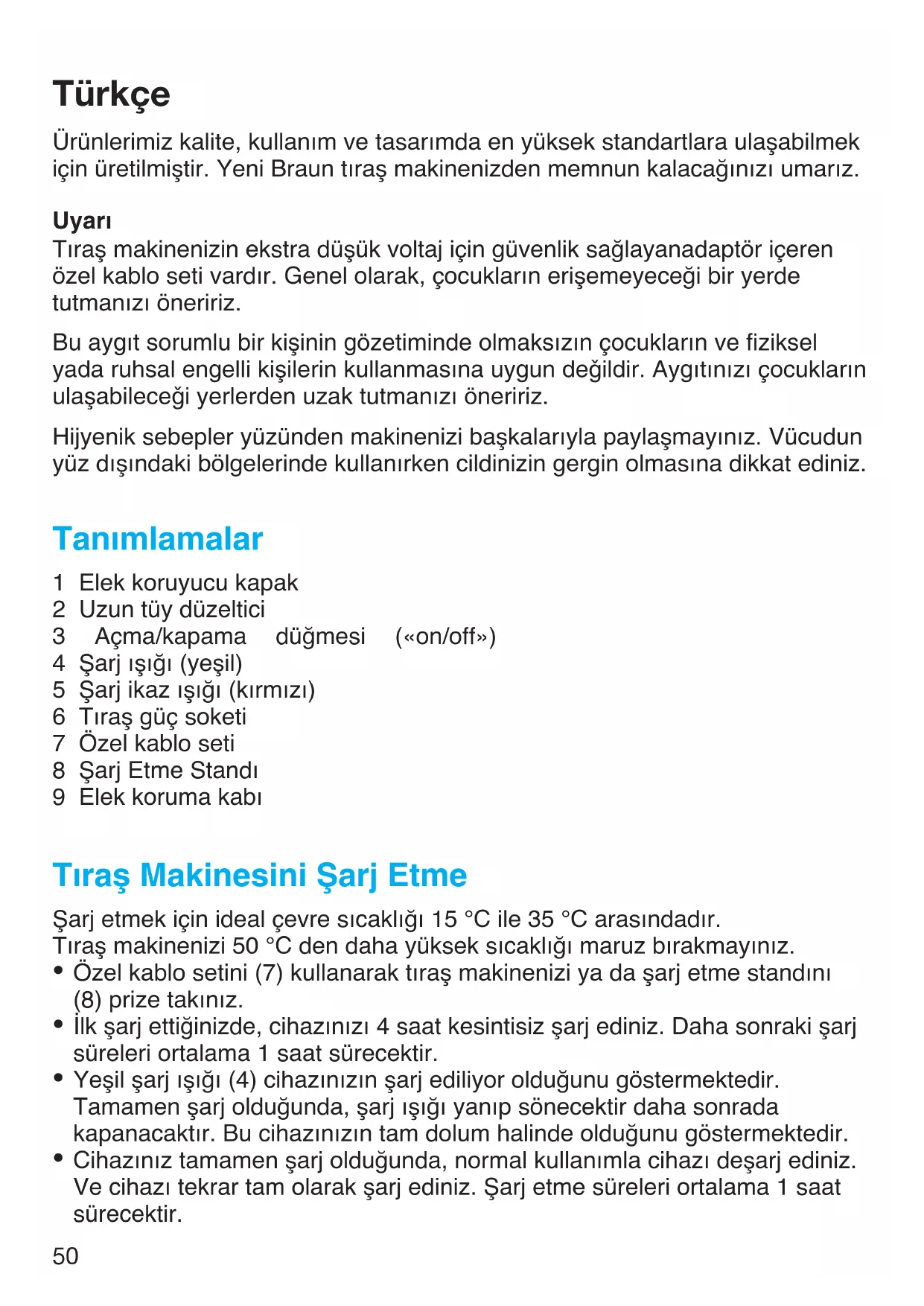 Tıraş makinenizi 50 °C den daha yüksek sıcaklığı maruz bırakmayınız.