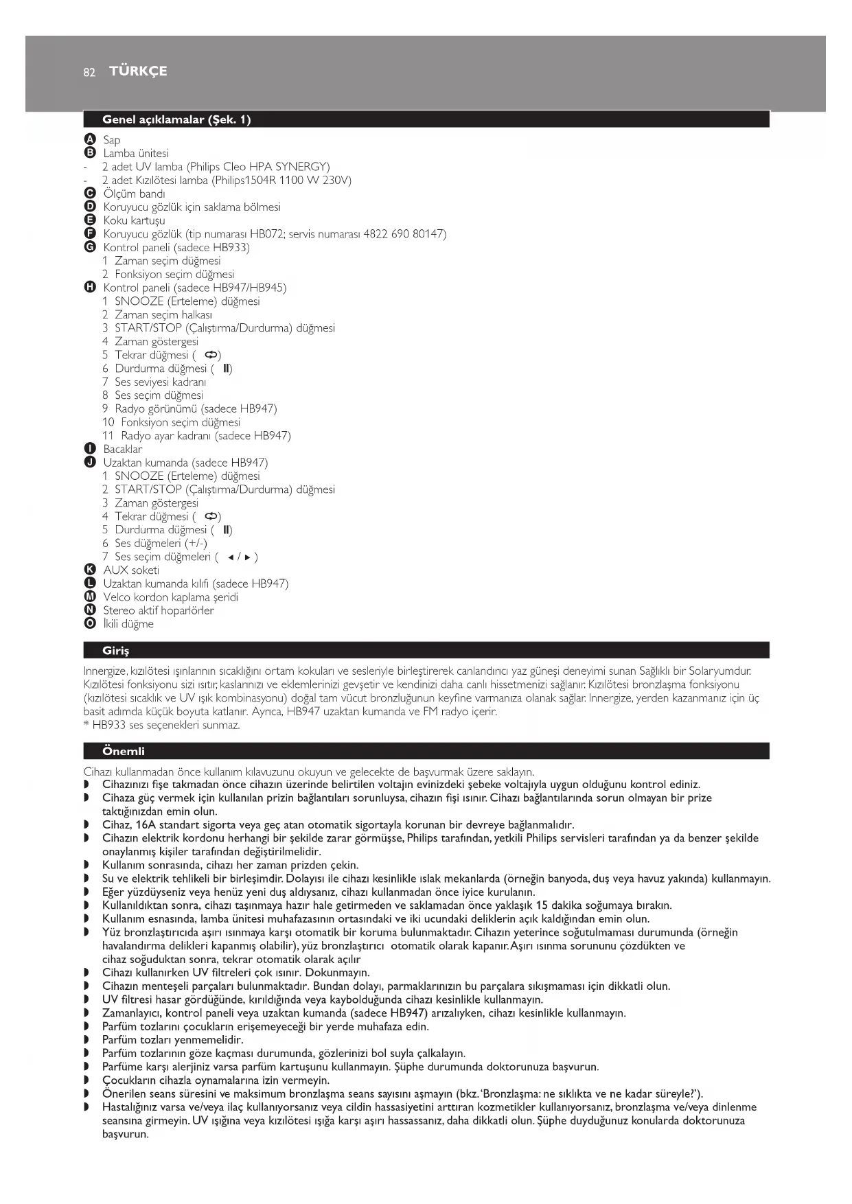 Bronzlaştırıcı lambaları (Cleo HPA Synergy) sadece yetkili Philips servis merkezi tarafından değiştirilmelidir. Bu işlem için sadece servis