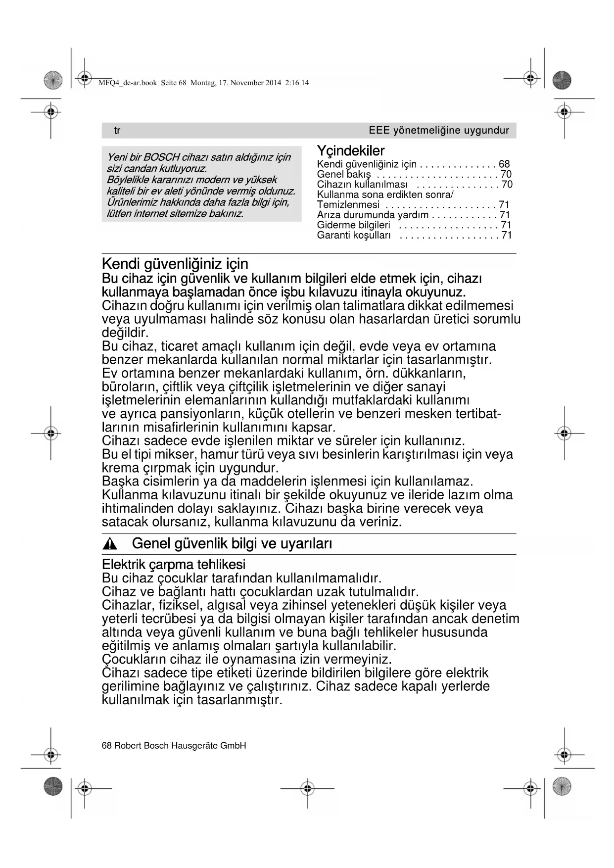 MFQ4_de-ar.book Seite 67 Montag, 17. November 2014 2:16 1468 5.960-552 A XXXXX (02/03) 68 Robert Bosch Hausgeräte GmbH Yçindekiler Kendi güvenliğiniz için . . . . . . . . . . . . . . 68Genel bakış . . . . . . . . . . . . . . . . . . . . . . 70Cihazın kullanılması . . . . . . . . . . . . . . . 70Kullanma sona erdikten sonra/Temizlenmesi . . . . . . . . . . . . . . . . . . . . 71Arıza durumunda yardım . . . . . . . . . . . . 71Giderme bilgileri . . . . . . . . . . . . . . . . . . 71Garanti koşulları . . . . . . . . . . . . . . . . . . 71 Kendi güvenliğiniz için