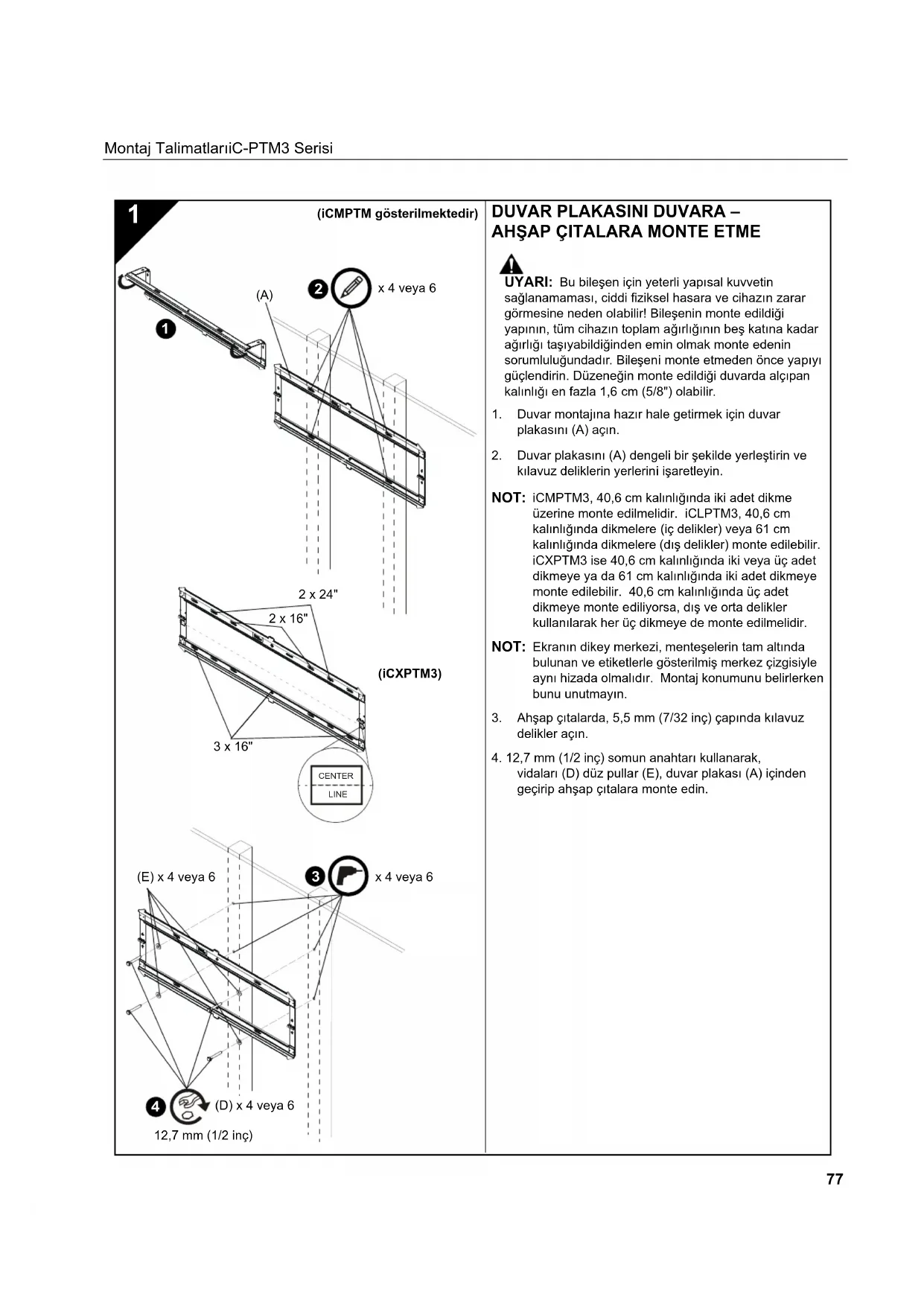x 4 veya 6 (D) x 4 veya 6 (E) x 4 veya 6 x 4 veya 6 2 x 24" 2 x 16" (iCXPTM3) 3 x 16"iC-PTM3 Serisi Montaj Talimatları