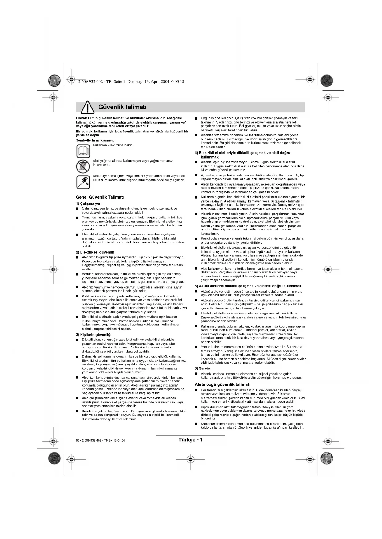 2 609 932 402 - GR Seite 5 Dienstag, 13. April 2004 6:03 1865 • 2 609 932 402 • TMS • 13.04.04Türkçe - 1 Dikkat! Bütün güvenlik talimat∂ ve hükümler okunmal∂d∂r. Aµaπ∂daki talimat hükümlerine uyulmad∂π∂ takdirde elektrik çarpmas∂, yang∂n ve/veya aπ∂r yaralanma tehlikeleri ortaya ç∂kabilir.Bir sonraki kullan∂m için bu güvenlik talimat∂n∂ ve hükümleri güvenli bir yerde saklay∂n.Sembollerin aç∂klamas∂: