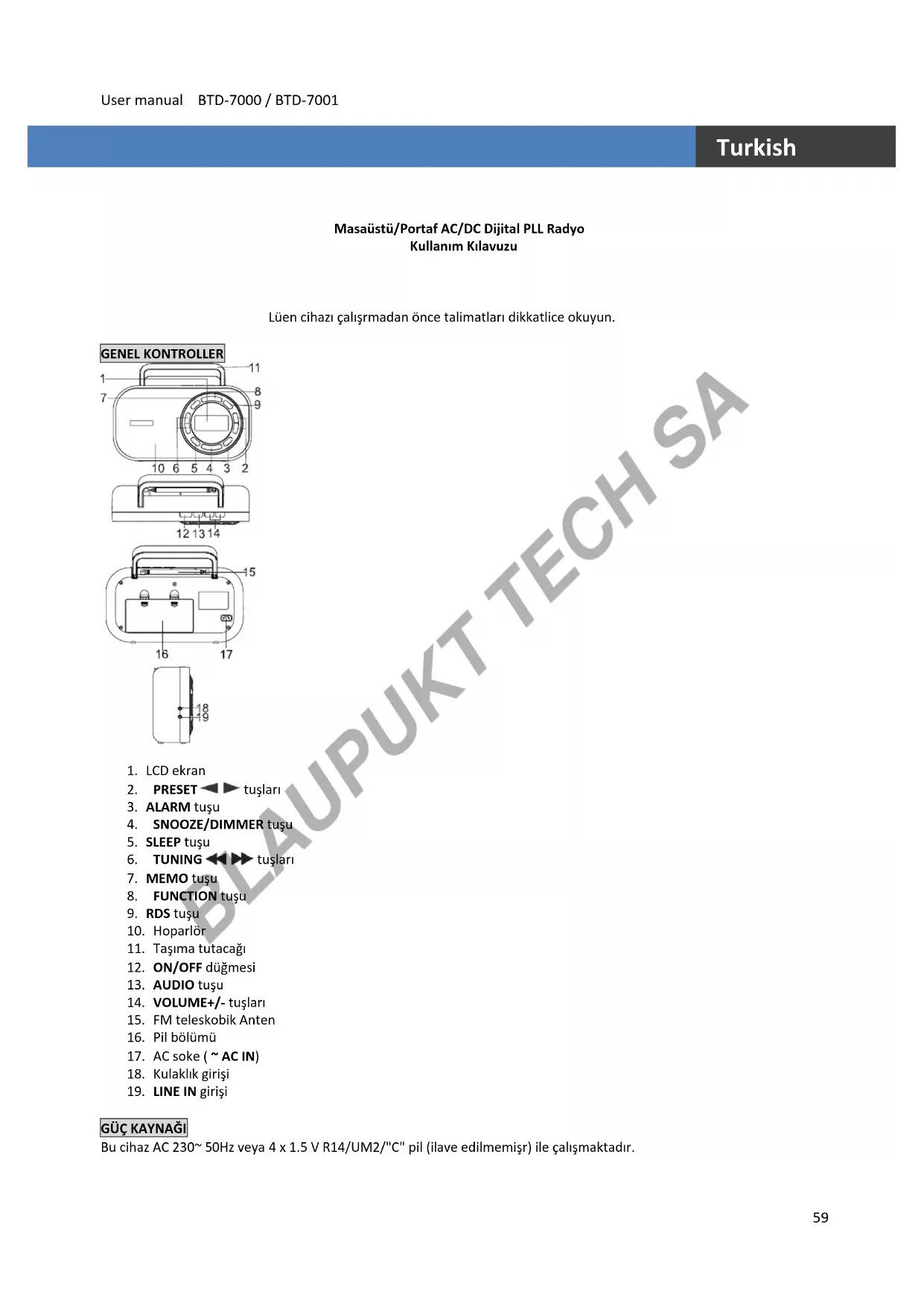 GÜÇ KAYNAĞI Bu cihaz AC 230~ 50Hz veya 4 x 1.5 V R14/UM2/"C" pil (ilave edilmemiştir) ile çalışmaktadır.