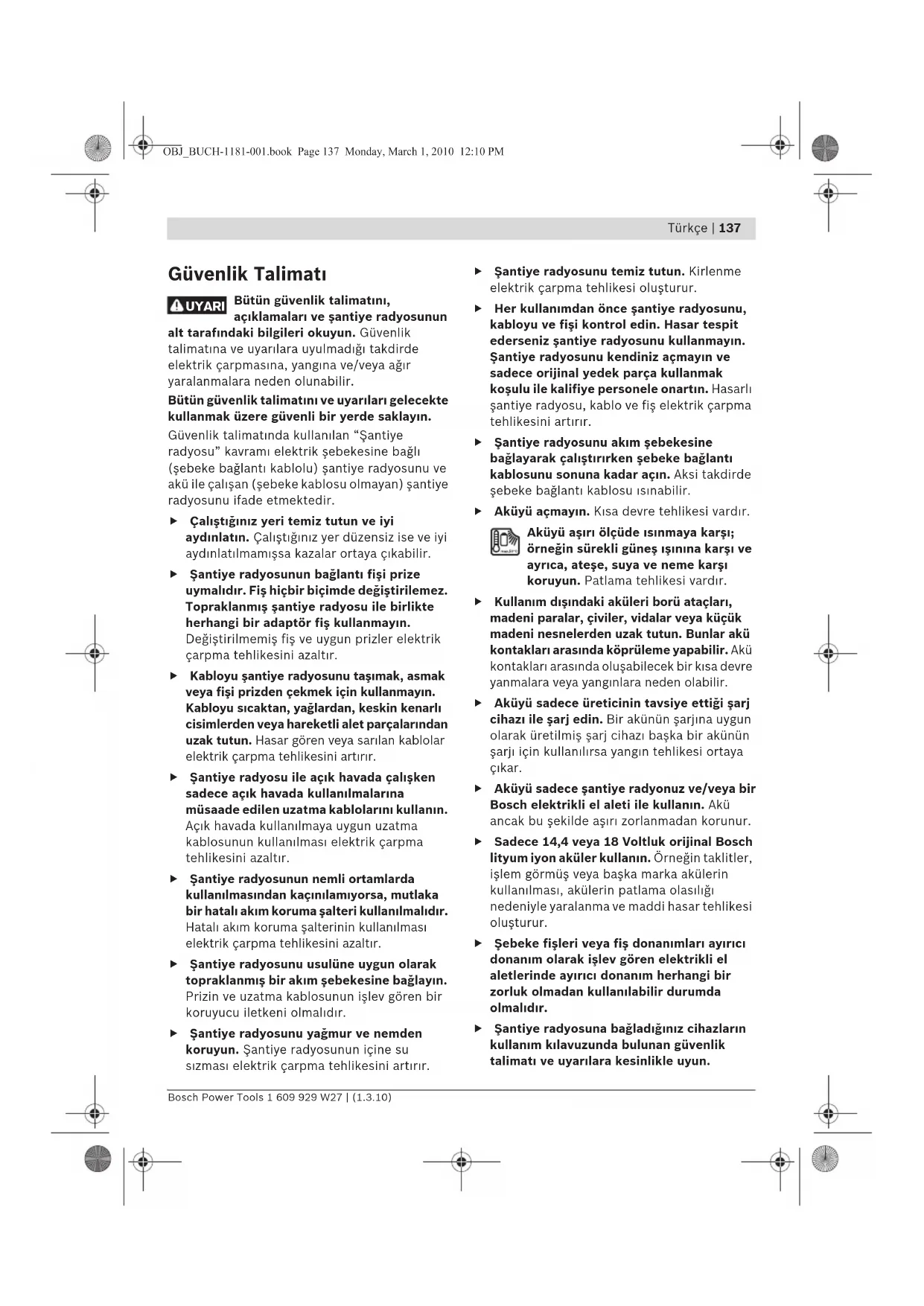Güvenlik Talimat Bütün güvenlik talimatn, açklamalar ve şantiye radyosunun alt tarafndaki bilgileri okuyun. Güvenlik talimatna ve uyarlara uyulmadğ takdirde elektrik çarpmasna, yangna ve/veya ağr yaralanmalara neden olunabilir. Bütün güvenlik talimatn ve uyarlar gelecekte kullanmak üzere güvenli bir yerde saklayn. Güvenlik talimatnda kullanlan “Şantiye radyosu” kavram elektrik şebekesine bağl (şebeke bağlant kablolu) şantiye radyosunu ve akü ile çalşan (şebeke kablosu olmayan) şantiye radyosunu ifade etmektedir. f Çalştğnz yeri temiz tutun ve iyi aydnlatn. Çalştğnz yer düzensiz ise ve iyi aydnlatlmamşsa kazalar ortaya çkabilir. f Şantiye radyosunun bağlant fişi prize uymaldr. Fiş hiçbir biçimde değiştirilemez. Topraklanmş şantiye radyosu ile birlikte herhangi bir adaptör fiş kullanmayn. Değiştirilmemiş fiş ve uygun prizler elektrik çarpma tehlikesini azaltr. f Kabloyu şantiye radyosunu taşmak, asmak veya fişi prizden çekmek için kullanmayn. Kabloyu scaktan, yağlardan, keskin kenarl cisimlerden veya hareketli alet parçalarndan uzak tutun. Hasar gören veya sarlan kablolar elektrik çarpma tehlikesini artrr. f Şantiye radyosu ile açk havada çalşken sadece açk havada kullanlmalarna müsaade edilen uzatma kablolarn kullann. Açk havada kullanlmaya uygun uzatma kablosunun kullanlmas elektrik çarpma tehlikesini azaltr. f Şantiye radyosunun nemli ortamlarda kullanlmasndan kaçnlamyorsa, mutlaka bir hatal akm koruma şalteri kullanlmaldr. Hatal akm koruma şalterinin kullanlmas elektrik çarpma tehlikesini azaltr. f Şantiye radyosunu usulüne uygun olarak topraklanmş bir akm şebekesine bağlayn. Prizin ve uzatma kablosunun işlev gören bir koruyucu iletkeni olmaldr. f Şantiye radyosunu yağmur ve nemden koruyun. Şantiye radyosunun içine su szmas elektrik çarpma tehlikesini artrr. f Şantiye radyosunu temiz tutun. Kirlenme elektrik çarpma tehlikesi oluşturur. f Her kullanmdan önce şantiye radyosunu, kabloyu ve fişi kontrol edin. Hasar tespit ederseniz şantiye radyosunu kullanmayn. Şantiye radyosunu kendiniz açmayn ve sadece orijinal yedek parça kullanmak koşulu ile kalifiye personele onartn. Hasarl şantiye radyosu, kablo ve fiş elektrik çarpma tehlikesini artrr. f Şantiye radyosunu akm şebekesine bağlayarak çalştrrken şebeke bağlant kablosunu sonuna kadar açn. Aksi takdirde şebeke bağlant kablosu snabilir. f Aküyü açmayn. Ksa devre tehlikesi vardr. Aküyü aşr ölçüde snmaya karş; örneğin sürekli güneş şnna karş ve ayrca, ateşe, suya ve neme karş koruyun. Patlama tehlikesi vardr. f Kullanm dşndaki aküleri borü ataçlar, madeni paralar, çiviler, vidalar veya küçük madeni nesnelerden uzak tutun. Bunlar akü kontaklar arasnda köprüleme yapabilir. Akü kontaklar arasnda oluşabilecek bir ksa devre yanmalara veya yangnlara neden olabilir. f Aküyü sadece üreticinin tavsiye ettiği şarj cihaz ile şarj edin. Bir akünün şarjna uygun olarak üretilmiş şarj cihaz başka bir akünün şarj için kullanlrsa yangn tehlikesi ortaya çkar. f Aküyü sadece şantiye radyonuz ve/veya bir Bosch elektrikli el aleti ile kullann. Akü ancak bu şekilde aşr zorlanmadan korunur. f Sadece 14,4 veya 18 Voltluk orijinal Bosch lityum iyon aküler kullann. Örneğin taklitler, işlem görmüş veya başka marka akülerin kullanlmas, akülerin patlama olaslğ nedeniyle yaralanma ve maddi hasar tehlikesi oluşturur. f Şebeke fişleri veya fiş donanmlar ayrc donanm olarak işlev gören elektrikli el aletlerinde ayrc donanm herhangi bir zorluk olmadan kullanlabilir durumda olmaldr. f Şantiye radyosuna bağladğnz cihazlarn kullanm klavuzunda bulunan güvenlik talimat ve uyarlara kesinlikle uyun. UYARI OBJ_BUCH-1181-001.book Page 137 Monday, March 1, 2010 12:10 PM138 | Türkçe 1 609 929 W27 | (1.3.10) Bosch Power Tools Fonksiyon tanm Bütün uyarlar ve talimat hükümle- rini okuyun. Açklanan uyarlara ve talimat hükümlerine uyulmadğ tak- dirde elektrik çarpmalarna, yangn- lara ve/veya ağr yaralanmalara neden olunabilir. Teknik veriler Şekli gösterilen elemanlar Şekli gösterilen bileşenlerin numaralar grafik sayfasndaki şantiye radyosunun şeklinin bulunduğu numaralarla ayndr. 1 Hoparlör 2 Taşma tutamağ 3 Alternatif akm bağlants kontrol şğ (3 601 D29 760 ürün kodunda değil) 4 Alternatif akm bağlants kapağ (3 601 D29 760 ürün kodunda değil) 5 Alternatif akm prizi (3 601 D29 760 ürün kodunda değil) 6 Batarya gözü kapağ kilidi (tampon bataryalar) 7 Batarya gözü kapağ (tampon bataryalar) 8 Medya gözü kapağ kilitleme kolu 9 Medya gözü kapağ 10 Çubuk anten 11 Akü yuvas 12 Akü gözü kapağ kilitleme kolu 13 Akü gözü kapağ 14 Akü* 15 Ses ön ayar seçme tuşu “Equalizer” 16 Hafza tuşu “Memory” 17 Manüel ses ayar tuşu “Custom” 18 Zaman ayar tuşu “Clock” 19 Verici ayar döner düğmesi “Tune” 20 Rastlantsal sra ile çalma/çalma tekrar tuşu 21 İleri doğru arama tuşu “Seek +/>>|” 22 Ses kaynağ seçme tuşu “Source” 23 Geriye doğru arama tuşu “|<</– Seek” 24 Çalma/ara verme tuşu 25 Ses şiddeti ayar döner düğmesi (“Volume”) ve ses tipi (“Bass/Treb”) 26 Sesli işletme açma/kapama tuşu 27 Display 28 “AUX 1 IN”-yuvas 29 12-V bağlant yuvas 30 “LINE OUT”-yuvas 31 Sigorta kapağ 32 12-V bağlant sigortas 33 USB yuvas Şantiye radoysu GML 20 Professional Ürün kodu 3 601 D29 7.. Tampon bataryalar 2x1,5 V (LR06/AA) Akü 14,4–18 V İşletme scaklğ °C 0...45 Saklama scaklğ °C –20...+70 Ağrlğ EPTA-Proce- dure 01/2003’e göre kg 10,2 Koruma snf