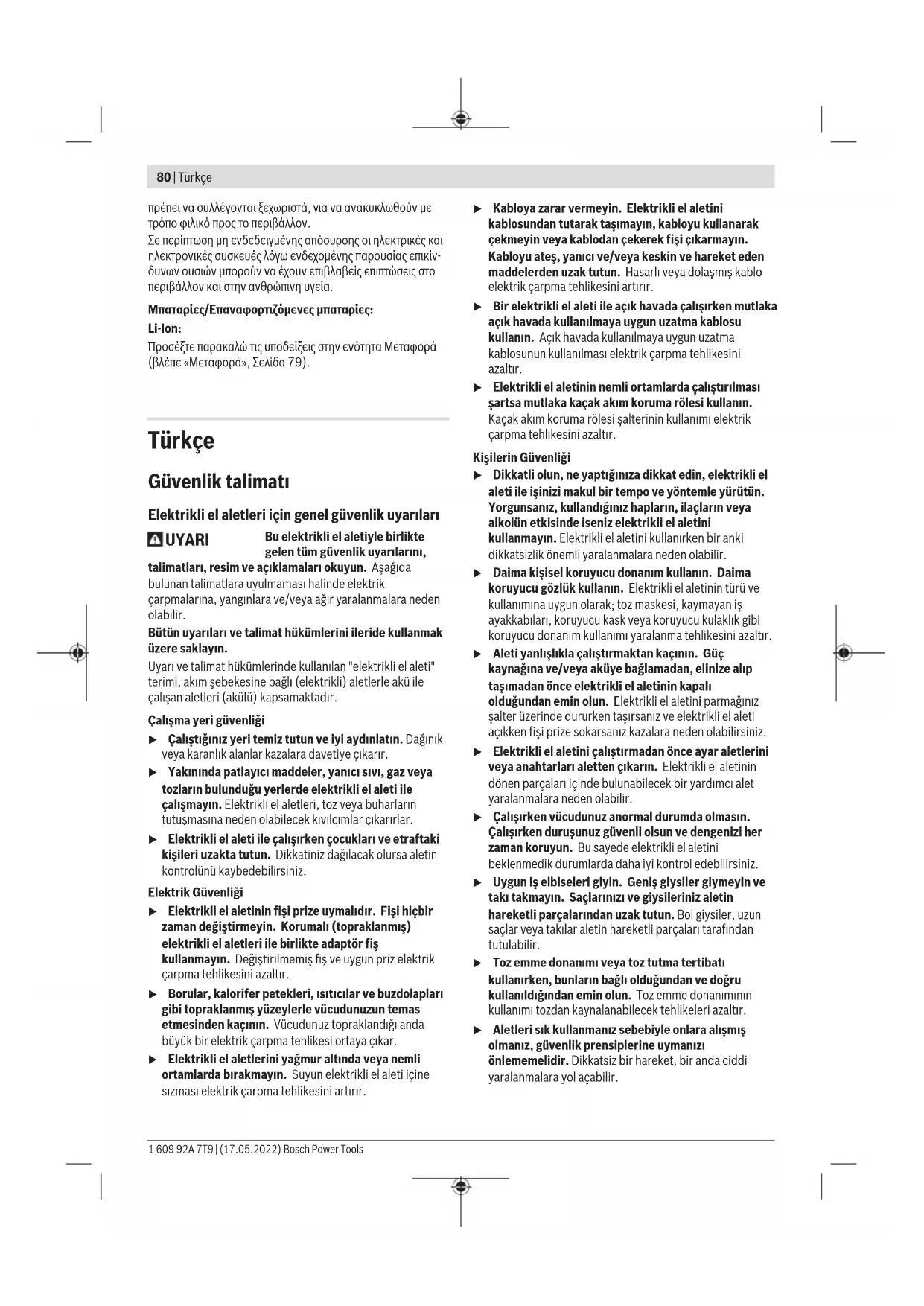 Τα ηλεκτρικά εργαλεία, οι μπαταρίες, τα εξαρτή- ματα και οι συσκευασίες πρέπει να ανακυκλώνο- νται με τρόπο φιλικό προς το περιβάλλον. Μην ρίχνετε τα ηλεκτρικά εργαλεία και τις μπατα- ρίες στα απορρίμματα του σπιτιού σας! Μόνο για χώρες τηςΕΕ: Σύμφωνα με την Ευρωπαϊκή οδηγία 2012/19/ΕΕ σχετικά με τις παλιές ηλεκτρικές και ηλεκτρονικές συσκευές και τη μετα- φορά της οδηγίας αυτής σε εθνικό δίκαιο τα άχρηστα ηλεκτρι- κά εργαλεία και σύμφωνα με την Ευρωπαϊκή οδηγία 2006/66/ΕΚ οι χαλασμένες ή χρησιμοποιημένες μπαταρίες Bosch Power Tools 1 609 92A 7T9 | (17.05.2022)80 | Türkçe πρέπει να συλλέγονται ξεχωριστά, για να ανακυκλωθούν με τρόπο φιλικό προς το περιβάλλον. Σε περίπτωση μη ενδεδειγμένης απόσυρσης οι ηλεκτρικές και ηλεκτρονικές συσκευές λόγω ενδεχομένης παρουσίας επικίν- δυνων ουσιών μπορούν να έχουν επιβλαβείς επιπτώσεις στο περιβάλλον και στην ανθρώπινη υγεία. Μπαταρίες/Επαναφορτιζόμενες μπαταρίες: Li-Ion: Προσέξτε παρακαλώ τις υποδείξεις στην ενότητα Μεταφορά (βλέπε «Μεταφορά», Σελίδα79). Türkçe Güvenlik talimatı Elektrikli el aletleri için genel güvenlik uyarıları UYARI Bu elektrikli el aletiyle birlikte gelen tüm güvenlik uyarılarını, talimatları, resim ve açıklamaları okuyun. Aşağıda bulunan talimatlara uyulmaması halinde elektrik çarpmalarına, yangınlara ve/veya ağır yaralanmalara neden olabilir. Bütün uyarıları ve talimat hükümlerini ileride kullanmak üzere saklayın. Uyarı ve talimat hükümlerinde kullanılan "elektrikli el aleti" terimi, akım şebekesine bağlı (elektrikli) aletlerle akü ile çalışan aletleri (akülü) kapsamaktadır. Çalışma yeri güvenliği u Çalıştığınız yeri temiz tutun ve iyi aydınlatın. Dağınık veya karanlık alanlar kazalara davetiye çıkarır. u Yakınında patlayıcı maddeler, yanıcı sıvı, gaz veya tozların bulunduğu yerlerde elektrikli el aleti ile çalışmayın. Elektrikli el aletleri, toz veya buharların tutuşmasına neden olabilecek kıvılcımlar çıkarırlar. u Elektrikli el aleti ile çalışırken çocukları ve etraftaki kişileri uzakta tutun. Dikkatiniz dağılacak olursa aletin kontrolünü kaybedebilirsiniz. Elektrik Güvenliği u Elektrikli el aletinin fişi prize uymalıdır. Fişi hiçbir zaman değiştirmeyin. Korumalı (topraklanmış) elektrikli el aletleri ile birlikte adaptör fiş kullanmayın. Değiştirilmemiş fiş ve uygun priz elektrik çarpma tehlikesini azaltır. u Borular, kalorifer petekleri, ısıtıcılar ve buzdolapları gibi topraklanmış yüzeylerle vücudunuzun temas etmesinden kaçının. Vücudunuz topraklandığı anda büyük bir elektrik çarpma tehlikesi ortaya çıkar. u Elektrikli el aletlerini yağmur altında veya nemli ortamlarda bırakmayın. Suyun elektrikli el aleti içine sızması elektrik çarpma tehlikesini artırır. u Kabloya zarar vermeyin. Elektrikli el aletini kablosundan tutarak taşımayın, kabloyu kullanarak çekmeyin veya kablodan çekerek fişi çıkarmayın. Kabloyu ateş, yanıcı ve/veya keskin ve hareket eden maddelerden uzak tutun. Hasarlı veya dolaşmış kablo elektrik çarpma tehlikesini artırır. u Bir elektrikli el aleti ile açık havada çalışırken mutlaka açık havada kullanılmaya uygun uzatma kablosu kullanın. Açık havada kullanılmaya uygun uzatma kablosunun kullanılması elektrik çarpma tehlikesini azaltır. u Elektrikli el aletinin nemli ortamlarda çalıştırılması şartsa mutlaka kaçak akım koruma rölesi kullanın. Kaçak akım koruma rölesi şalterinin kullanımı elektrik çarpma tehlikesini azaltır. Kişilerin Güvenliği u Dikkatli olun, ne yaptığınıza dikkat edin, elektrikli el aleti ile işinizi makul bir tempo ve yöntemle yürütün. Yorgunsanız, kullandığınız hapların, ilaçların veya alkolün etkisinde iseniz elektrikli el aletini kullanmayın. Elektrikli el aletini kullanırken bir anki dikkatsizlik önemli yaralanmalara neden olabilir. u Daima kişisel koruyucu donanım kullanın. Daima koruyucu gözlük kullanın. Elektrikli el aletinin türü ve kullanımına uygun olarak; toz maskesi, kaymayan iş ayakkabıları, koruyucu kask veya koruyucu kulaklık gibi koruyucu donanım kullanımı yaralanma tehlikesini azaltır. u Aleti yanlışlıkla çalıştırmaktan kaçının. Güç kaynağına ve/veya aküye bağlamadan, elinize alıp taşımadan önce elektrikli el aletinin kapalı olduğundan emin olun. Elektrikli el aletini parmağınız şalter üzerinde dururken taşırsanız ve elektrikli el aleti açıkken fişi prize sokarsanız kazalara neden olabilirsiniz. u Elektrikli el aletini çalıştırmadan önce ayar aletlerini veya anahtarları aletten çıkarın. Elektrikli el aletinin dönen parçaları içinde bulunabilecek bir yardımcı alet yaralanmalara neden olabilir. u Çalışırken vücudunuz anormal durumda olmasın. Çalışırken duruşunuz güvenli olsun ve dengenizi her zaman koruyun. Bu sayede elektrikli el aletini beklenmedik durumlarda daha iyi kontrol edebilirsiniz. u Uygun iş elbiseleri giyin. Geniş giysiler giymeyin ve takı takmayın. Saçlarınızı ve giysileriniz aletin hareketli parçalarından uzak tutun. Bol giysiler, uzun saçlar veya takılar aletin hareketli parçalar