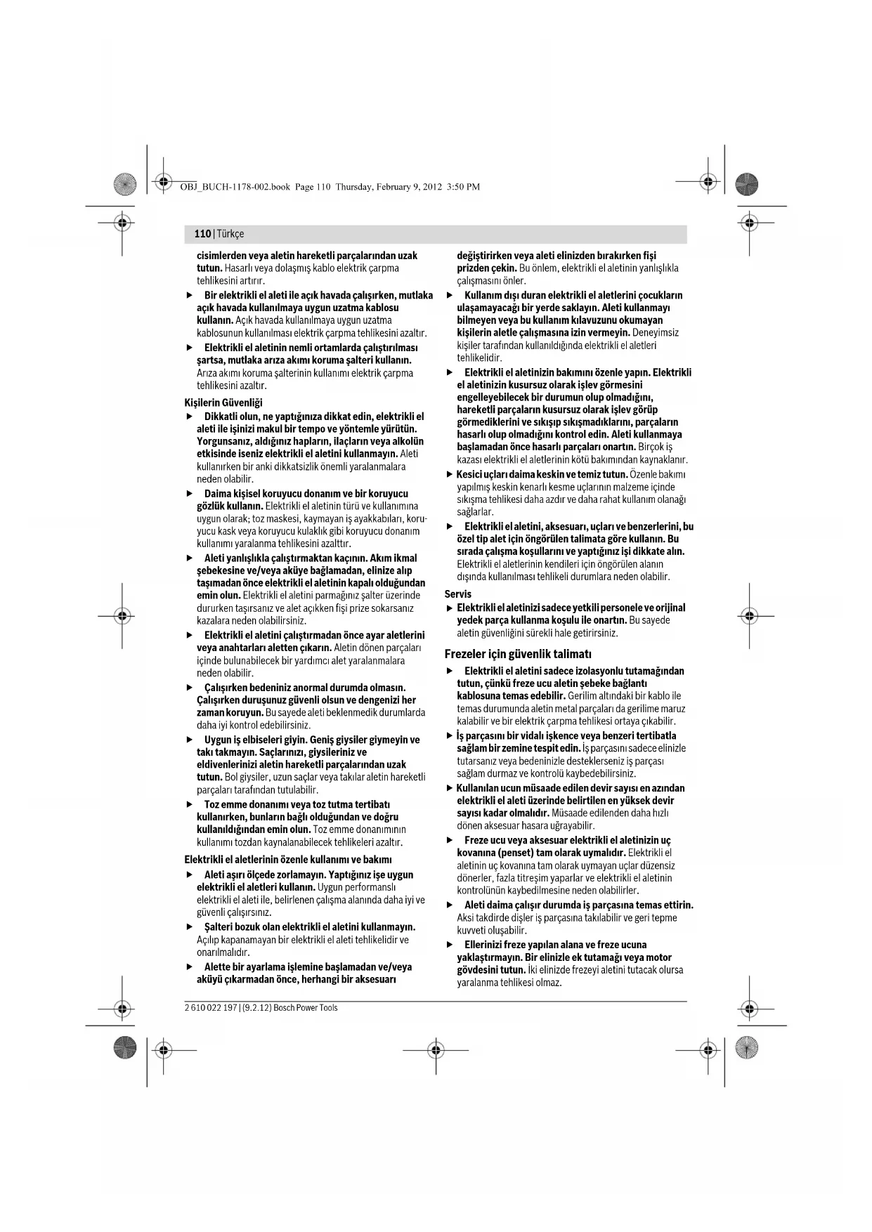 Elektrikli el aletinizi sadece yetkili personele ve orijinal yedek parça kullanma koşulu ile onartn. Bu sayede aletin güvenliğini sürekli hale getirirsiniz. Frezeler için güvenlik talimat f Elektrikli el aletini sadece izolasyonlu tutamağndan tutun, çünkü freze ucu aletin şebeke bağlant kablosuna temas edebilir. Gerilim altndaki bir kablo ile temas durumunda aletin metal parçalar da gerilime maruz kalabilir ve bir elektrik çarpma tehlikesi ortaya çkabilir. f İş parçasn bir vidal işkence veya benzeri tertibatla sağlam bir zemine tespit edin. İş parçasn sadece elinizle tutarsanz veya bedeninizle desteklerseniz iş parças sağlam durmaz ve kontrolü kaybedebilirsiniz. f Kullanlan ucun müsaade edilen devir says en azndan elektrikli el aleti üzerinde belirtilen en yüksek devir says kadar olmaldr. Müsaade edilenden daha hzl dönen aksesuar hasara uğrayabilir. f Freze ucu veya aksesuar elektrikli el aletinizin uç kovanna (penset) tam olarak uymaldr. Elektrikli el aletinin uç kovanna tam olarak uymayan uçlar düzensiz dönerler, fazla titreşim yaparlar ve elektrikli el aletinin kontrolünün kaybedilmesine neden olabilirler. f Aleti daima çalşr durumda iş parçasna temas ettirin. Aksi takdirde dişler iş parçasna taklabilir ve geri tepme kuvveti oluşabilir. f Ellerinizi freze yaplan alana ve freze ucuna yaklaştrmayn. Bir elinizle ek tutamağ veya motor gövdesini tutun. İki elinizde frezeyi aletini tutacak olursa yaralanma tehlikesi olmaz. OBJ_BUCH-1178-002.book Page 110 Thursday, February 9, 2012 3:50 PMTürkçe | 111 Bosch Power Tools 2 610 022 197 | (9.2.12) f Metal nesnelerin, çivilerin veya vidalarn üzerinde hiçbir zaman freze yapmayn. Aksi halde freze ucu hasar görebilir ve yüksek titreşimler ortaya çkabilir. f Görünmeyen ikmal hatlarn tespit etmek üzere uygun tarama cihazlar kullann veya mahalli ikmal şirketlerinden yardm aln. Elektrik kablolaryla temas yanklara ve elektrik çarpmasna neden olabilir. Bir gaz borusuna hasar vermek patlamalar ortaya çkarabilir. Bir su borusuna girmek maddi hasara veya elektrik çarpmasna neden olabilir. f Körelmiş veya hasarl frezeleri kullanmayn. Körelmiş veya hasarl frezeler yüksek sürtünme kuvvetine neden olurlar, skşabilirler ve balanssz dönerler. f Çalşrken elektrikli el aletini iki elinizle skca tutun ve duruş pozisyonunuzun güvenli olmasna dikkat edin. Elektrikli el aleti iki elle daha güvenli kullanlr. f İş parçasn emniyete aln. Bir germe tertibat veya mengene ile sabitlenen iş parças elle tutmaya oranla daha güvenli tutulur. f Elinizden brakmadan önce elektrikli el aletinin tam olarak durmasn bekleyin. Alete taklan uç skşabilir ve elektrikli el aletinin kontrolünü kaybedebilirsiniz. Ürün ve işlev tanm Bütün uyarlar ve talimat hükümlerini okuyun. Açklanan uyarlara ve talimat hükümlerine uyulmadğ takdirde elektrik çarpmalarna, yangnlara ve/veya ağr yaralanmalara neden olunabilir. Lütfen aletin resminin göründüğü sayfay açn ve bu kullanm klavuzunu okuduğunuz sürece bu sayfay açk tutun. Usulüne uygun kullanm Bu alet; sağlam bir zemin üzerinde ahşap, plastik, hafif yap malzemelerinde oluk açma, kenar traşlama, profil çekme ve uzunlama delik açma işleri ve kopyalama frezeleri için geliştirilmiştir. Bu aletle düşük devir says ve uygun freze uçlar ile metal dş malzeme de işlenebilir. Şekli gösterilen elemanlar Şekli gösterilen elemanlarn numaralar grafik sayfasndaki elektrikli el aleti resmindeki numaralarla ayndr. 1 Freze motoru 2 Malzeme içine dalma birimi 3 Kopyalama birimi 4 Tutamak (izolasyonlu tutamak yüzeyi) 5 Freze derinliği hassas ayar için döner düğme (Malzeme içine dalma birimi) 6 Freze derinliği hassas ayar skalas 7 Dalma fonksiyonu boşa alma kolu 8 Hassas ayar için endeks işareti 9 Freze derinliği ayar skalas (Malzeme içine dalma birimi) 10 Endeks işaretli sürücü (Malzeme içine dalma birimi) 11 Derinlik mesnedi (Malzeme içine dalma birimi) 12 Revolver dayamağ 13 Taban levhas 14 Kayc levha 15 Devir says ön seçim düğmesi 16 Derinlik mesnedi trtll vidas (Malzeme içine dalma birimi) 17 Pensetli başlk somunu 18 Freze ucu* 19 Açma/kapama şalteri tespit tuşu 20 Açma/kapama şalteri 21 Motor alma emniyet tuşu 22 Malzeme içine dalma/kopyalama birimi germe kolu 23 Paralellik mesnedi-Klavuz kol yuvas 24 Freze derinliği hassas ayar için döner düğme (Kopyalama birimi) 25 Freze derinliği kaba ayar için germe kolu (Kopyalama birimi) 26 Kopyalama birimindeki freze derinliği kaba ayar için oluklar 27 Mil kilitleme düğmesi 28 Çatal anahtar 24 mm 29 Emme adaptörü trtll vidas(2x) * 30 Emme adaptörü (Malzeme içine dalma birimi)* 31 Emme hortumu (Ø 35 mm)* 32 Emme adaptörü (Kopyalama birimi)* 33 Emme adaptörü ara halkas (Kopyalama birimi)* 34 Freze derinliği ayar skalas (Kopyalama birimi) 35 Paralellik mesnedi* 36 Paralellik mesnedi klavuz kolu (2x)* 37 Paralellik mesnedi hassas ayar için kelebek başl vida (2x)* 38 Paralellik mesnedi kaba ayar için kelebek başl vida (2x)* 39 Paralellik mesnedi hassas ayar için döner düğme* 40 Paralellik mesnedi için ayarlanabilir dayamak ray * 41 Paralellik mesnedi klavuz kolu için kelebek başl vida (2x)* 42 Freze pergeli/Klavuz ray adaptörü*