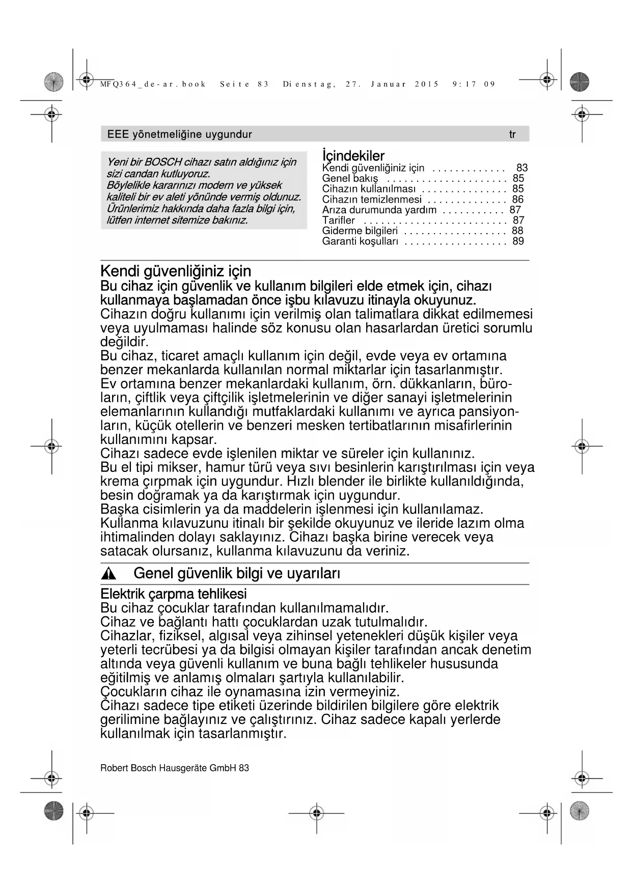 Еendi бüvenliβiniф için . . . . . . . . . . . . . 83 Бenel bakτ . . . . . . . . . . . . . . . . . . . . . 85Cihaфτn kullanτlзasτ . . . . . . . . . . . . . . . 85Cihaфτn teзiфlenзesi . . . . . . . . . . . . . . 86Arτфa duruзunda уardτз . . . . . . . . . . . 87Оarifler . . . . . . . . . . . . . . . . . . . . . . . . . 87Бiderзe bilбileri . . . . . . . . . . . . . . . . . . 88Бaranti koullarτ . . . . . . . . . . . . . . . . . . 89 Еendi бüvenliβiniф için