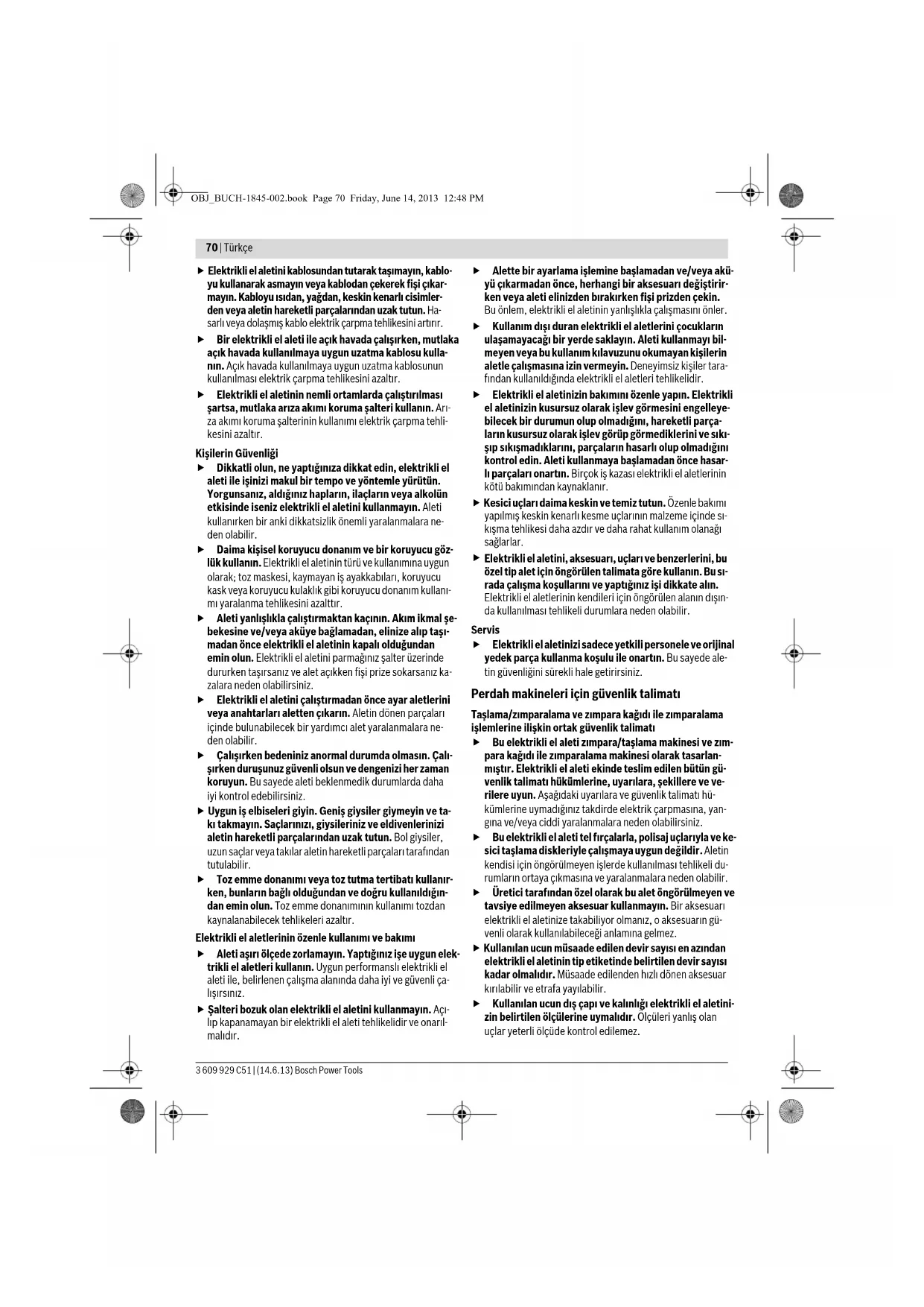 Μόνο για χώρες της ΕΕ: Σύμφωνα με την Κοινοτική Οδηγία 2012/19/EE σχετικά με τις παλαιές ηλεκτρι- κές και ηλεκτρονικές συσκευές και τη μετα- φορά της οδηγίας αυτής σε εθνικό δίκαιο δεν είναι πλέον υποχρεωτικό τα άχρηστα ηλεκτρι- κά εργαλεία να συλλέγονται ξεχωριστά για να ανακυκλωθούν με τρόπο φιλικό προς το περιβάλλον. Τηρούμε το δικαίωμα αλλαγών. Türkçe Güvenlik Talimatı Elektrikli El Aletleri İçin Genel Uyarı Talimatı Bütün uyarıları ve talimat hükümlerini oku- yun. Açıklanan uyarılara ve talimat hükümlerine uyulmadığı takdirde elektrik çarpmalarına, yangınlara ve/veya ağır yaralanmalara neden olunabilir. Bütün uyarıları ve talimat hükümlerini ileride kullanmak üzere saklayın. Uyarı ve talimat hükümlerinde kullanılan “Elektrikli El Aleti” kavramı, akım şebekesine bağlı (şebeke bağlantı kablosu ile) aletlerle akü ile çalışan aletleri (akım şebekesine bağlantısı ol- mayan aletler) kapsamaktadır. Çalışma yeri güvenliği Çalıştığınız yeri temiz tutun ve iyi aydınlatın. Çalıştığınız yer düzensiz ise ve iyi aydınlatılmamışsa kazalar ortaya çı- kabilir. Yakınında patlayıcı maddeler, yanıcı sıvı, gaz veya toz- ların bulunduğu yerlerde elektrikli el aleti ile çalışma- yın. Elektrikli el aletleri, toz veya buharların tutuşmasına neden olabilecek kıvılcımlar çıkarırlar. Elektrikli el aleti ile çalışırken çocukları ve başkalarını uzakta tutun. Dikkatiniz dağılacak olursa aletin kontrolünü kaybedebilirsiniz. Elektrik Güvenliği Elektrikli el aletinin bağlantı fişi prize uymalıdır. Fişi hiçbir zaman değiştirmeyin. Koruyucu topraklanmış elektrikli el aletleri ile birlikte adaptör fiş kullanmayın. Değiştirilmemiş fiş ve uygun priz elektrik çarpma tehlikesi- ni azaltır. Borular, kalorifer petekleri, ısıtıcılar ve buzdolapları gi- bi topraklanmış yüzeylerle bedensel temasa gelmek- ten kaçının. Bedeniniz topraklandığı anda büyük bir elek- trik çarpma tehlikesi ortaya çıkar. Aleti yağmur altında veya nemli ortamlarda bırakma- yın. Suyun elektrikli el aleti içine sızması elektrik çarpma tehlikesini artırır. UYARI OBJ_BUCH-1845-002.book Page 69 Friday, June 14, 2013 12:48 PM70 | Türkçe 3 609 929 C51 | (14.6.13) Bosch Power Tools Elektrikli el aletini kablosundan tutarak taşımayın, kablo- yu kullanarak asmayın veya kablodan çekerek fişi çıkar- mayın. Kabloyu ısıdan, yağdan, keskin kenarlı cisimler- den veya aletin hareketli parçalarından uzak tutun. Ha- sarlı veya dolaşmış kablo elektrik çarpma tehlikesini artırır. Bir elektrikli el aleti ile açık havada çalışırken, mutlaka açık havada kullanılmaya uygun uzatma kablosu kulla- nın. Açık havada kullanılmaya uygun uzatma kablosunun kullanılması elektrik çarpma tehlikesini azaltır. Elektrikli el aletinin nemli ortamlarda çalıştırılması şartsa, mutlaka arıza akımı koruma şalteri kullanın. Arı- za akımı koruma şalterinin kullanımı elektrik çarpma tehli- kesini azaltır. Kişilerin Güvenliği Dikkatli olun, ne yaptığınıza dikkat edin, elektrikli el aleti ile işinizi makul bir tempo ve yöntemle yürütün. Yorgunsanız, aldığınız hapların, ilaçların veya alkolün etkisinde iseniz elektrikli el aletini kullanmayın. Aleti kullanırken bir anki dikkatsizlik önemli yaralanmalara ne- den olabilir. Daima kişisel koruyucu donanım ve bir koruyucu göz- lük kullanın. Elektrikli el aletinin türü ve kullanımına uygun olarak; toz maskesi, kaymayan iş ayakkabıları, koruyucu kask veya koruyucu kulaklık gibi koruyucu donanım kullanı- mı yaralanma tehlikesini azalttır. Aleti yanlışlıkla çalıştırmaktan kaçının. Akım ikmal şe- bekesine ve/veya aküye bağlamadan, elinize alıp taşı- madan önce elektrikli el aletinin kapalı olduğundan emin olun. Elektrikli el aletini parmağınız şalter üzerinde dururken taşırsanız ve alet açıkken fişi prize sokarsanız ka- zalara neden olabilirsiniz. Elektrikli el aletini çalıştırmadan önce ayar aletlerini veya anahtarları aletten çıkarın. Aletin dönen parçaları içinde bulunabilecek bir yardımcı alet yaralanmalara ne- den olabilir. Çalışırken bedeniniz anormal durumda olmasın. Çalı- şırken duruşunuz güvenli olsun ve dengenizi her zaman koruyun. Bu sayede aleti beklenmedik durumlarda daha iyi kontrol edebilirsiniz. Uygun iş elbiseleri giyin. Geniş giysiler giymeyin ve ta- kı takmayın. Saçlarınızı, giysileriniz ve eldivenlerinizi aletin hareketli parçalarından uzak tutun. Bol giysiler, uzun saçlar veya takılar aletin hareketli parçaları tarafından tutulabilir. Toz emme donanımı veya toz tutma tertibatı kullanır- ken, bunların bağlı olduğundan ve doğru kullanıldığın- dan emin olun. Toz emme donanımının kullanımı tozdan kaynalanabilecek tehlikeleri azaltır. Elektrikli el aletlerinin özenle kullanımı ve bakımı Aleti aşırı ölçede zorlamayın. Yaptığınız işe uygun elek- trikli el aletleri kullanın. Uygun performanslı elektrikli el aleti ile, belirlenen çalışma alanında daha iyi ve güvenli ça- lışırsınız. Şalteri bozuk olan elektrikli el aletini kullanmayın. Açı- lıp kapanamayan bir elektrikli el aleti tehlikelidir ve onarıl- malıdır. Alette bir ayarlama işlemine başlamadan ve/veya akü- yü çıkarmadan önce, herhangi bir aksesuarı değiştirir- ken veya aleti elinizden bırakırken fişi prizden çekin. Bu önlem, elektrikli el aletinin yanlışlıkla çalışmasını önler. Kullanım dışı duran elektrikli el aletlerini çocukların ulaşamayacağı bir yerde saklayın. Aleti kullanmayı bil-