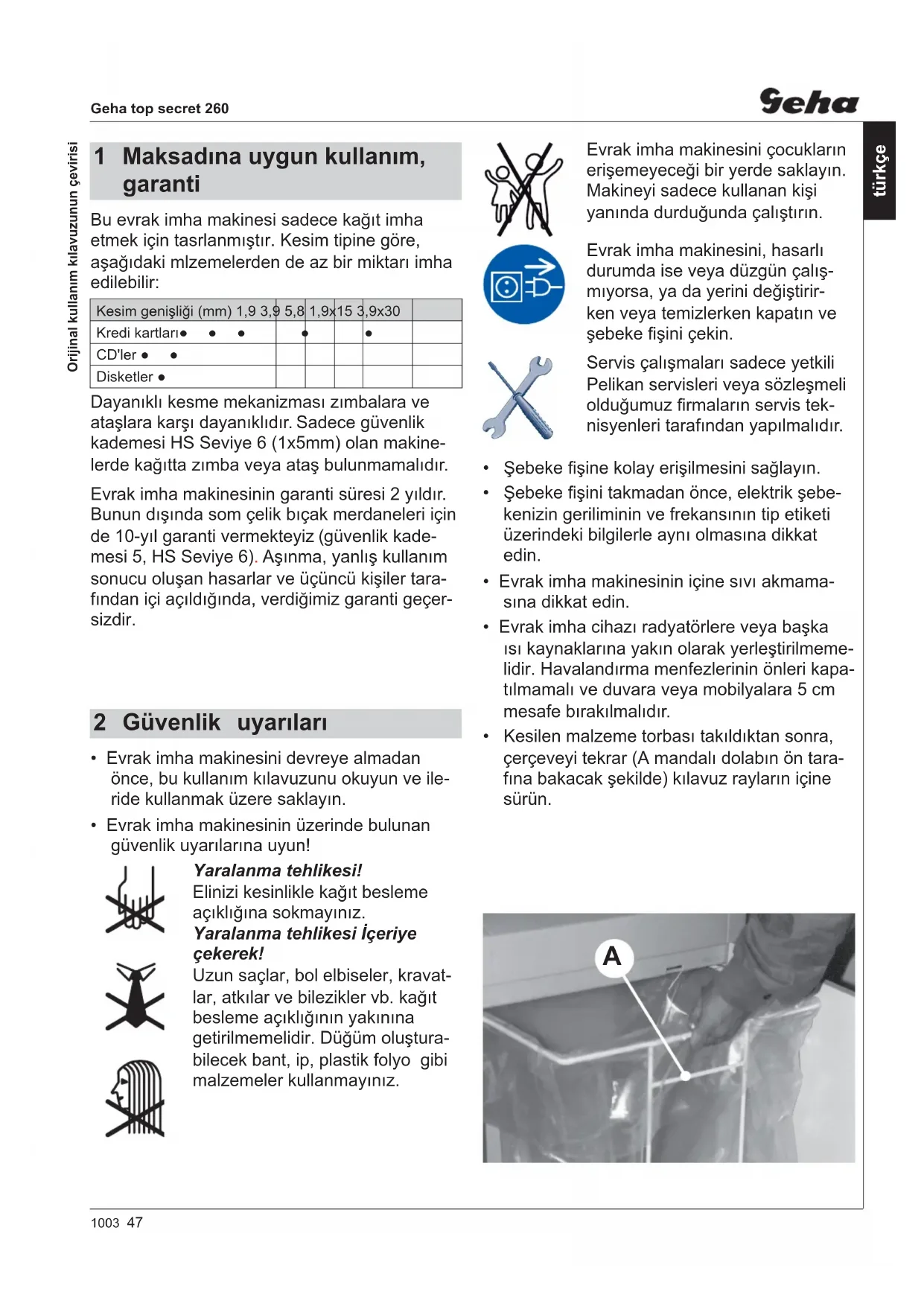 - EN 60950-1:20061003 47 Geha top secret 260 türkçe Bu evrak imha makinesi sadece kağıt imha etmek için tasrlanmıştır. Kesim tipine göre, aşağıdaki mlzemelerden de az bir miktarı imha edilebilir: Kesim genişliği (mm) 1,9 3,9 5,8 1,9x15 3,9x30 Kredi kartları ●●● ● ● CD'ler ●● Disketler ● Dayanıklı kesme mekanizması zımbalara ve ataşlara karşı dayanıklıdır. Sadece güvenlik kademesi HS Seviye 6 (1x5mm) olan makine- lerde kağıtta zımba veya ataş bulunmamalıdır. Evrak imha makinesinin garanti süresi 2 yıldır. Bunun dışında som çelik bıçak merdaneleri için de 10-yıl garanti vermekteyiz