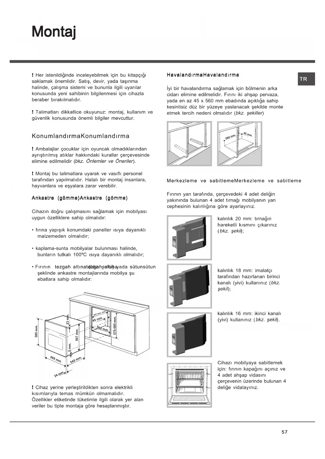 Iyi bir havalandirma saglamak icin bolmenin arka cidari elimine edilmelidir. Firini iki ahsap pervaza, yada en az 45 x 560 mm ebadinda açiklaga sahip kesintisiz diz bir yüzeye yaslanacak sekilde monte etmek tercih nedeni olmaldir (bkz. sekiller)
