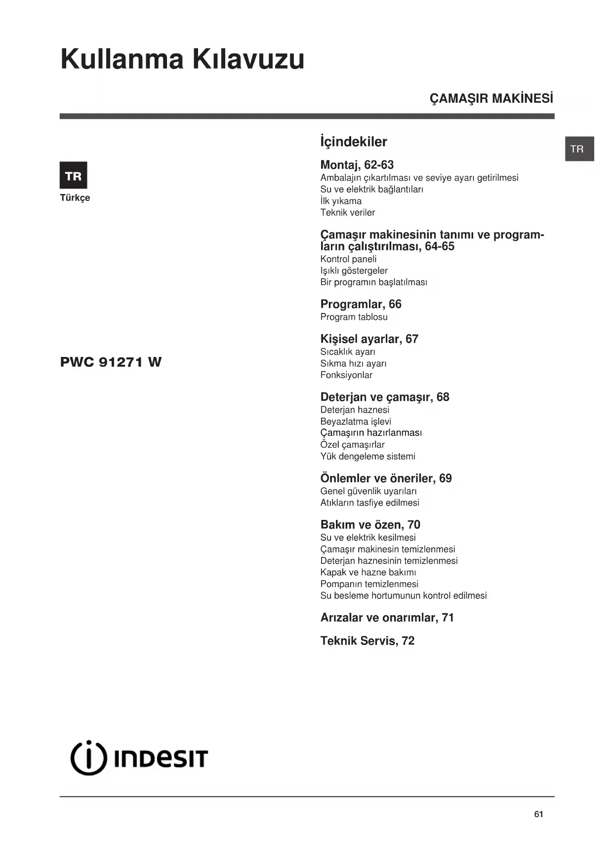 larýn çalýþtýrýlmasý, 64-65 Kontrol paneliIþýklý göstergelerBir programýn baþlatýlmasý Programlar, 66 Program tablosu Kiþisel ayarlar, 67 Sýcaklýk ayarýSýkma hýzý ayarýFonksiyonlar Deterjan ve çamaþýr, 68 Deterjan haznesiBeyazlatma iþlevi Çamaþýrýn hazýrlanmasý Özel çamaþýrlarYük dengeleme sistemi Önlemler ve öneriler, 69 Genel güvenlik uyarýlarýAtýklarýn tasfiye edilmesi Bakým ve özen, 70 Su ve elektrik kesilmesiÇamaþýr makinesin temizlenmesiDeterjan haznesinin temizlenmesiKapak ve hazne bakýmýPompanýn temizlenmesiSu besleme hortumunun kontrol edilmesi Arýzalar ve onarýmlar, 71