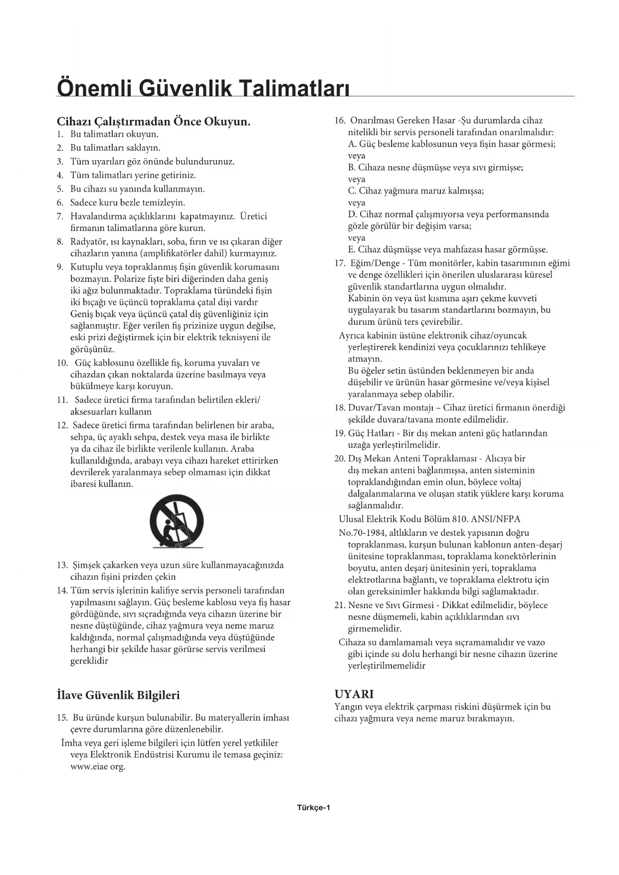 sehpa, üç ayaklı sehpa, destek veya masa ile birlikte ya da cihaz ile birlikte verilenle kullanın. Araba kullanıldığında, arabayı veya cihazı hareket ettirirken devrilerek yaralanmaya sebep olmaması için dikkat ibaresi kullanın.