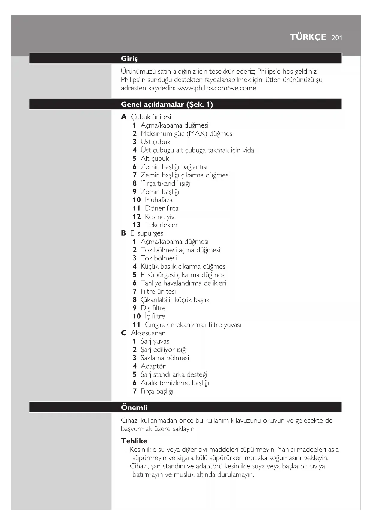 - Cihazı, şarj standını ve adaptörü kesinlikle suya veya başka bir sıvıya