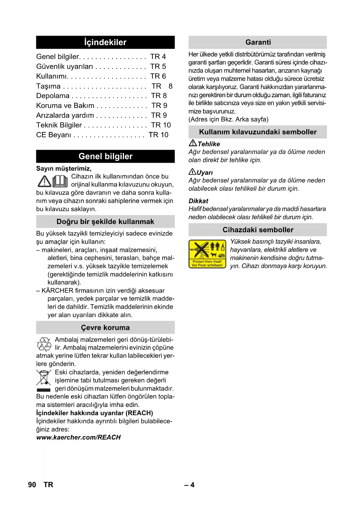 Τύπος: 1.674-xxx Σχετικές οδηγίες των Ε.Κ. 2006/42/EK (+2009/127/EK) 2004/108/EΚ 2000/14/EΚ Εφαρμοσθέντα εναρμονισμένα πρότυπα EN 55014–1: 2006 + A1: 2009 EN 55014–2: 1997 + A2: 2008 EN 60335–1 EN 60335–2–79 EN 61000–3–2: 2006 + A2: 2009 EN 61000–3–3: 2008 EN 62233: 2008 Εφαρμοσθείσα διαδικασία συμμόρφωσης 2000/14/EΚ: Παράρτημα V στάθμη ηχητικής πίεσης dB(A) Μετρημένη:86 Εγγυημένη: 89 CEO Head of Approbation 89EL– 4 Sayın müşterimiz, Cihazın ilk kullanımından önce bu orijinal kullanma kılavuzunu okuyun, bu kılavuza göre davranın ve daha sonra kulla- nım veya cihazın sonraki sahiplerine vermek için bu kılavuzu saklayın. Bu yüksek tazyikli temizleyiciyi sadece evinizde şu amaçlar için kullanın: – makineleri, araçları, inşaat malzemesini, aletleri, bina cephesini, terasları, bahçe mal- zemeleri v.s. yüksek tazyikle temizelemek (gerektiğinde temizlik maddelerinin katkısını kullanarak). – KÄRCHER firmasının izin verdiği aksesuar parçaları, yedek parçalar ve temizlik madde- leri de dahildir. Temizlik maddelerinin ekinde yer alan uyarıları dikkate alın. Ambalaj malzemeleri geri dönüş-türülebi- lir. Ambalaj malzemelerini evinizin çöpüne atmak yerine lütfen tekrar kullan labilecekleri yer- lere gönderin. Eski cihazlarda, yeniden değerlendirme işlemine tabi tutulması gereken değerli geri dönüşüm malzemeleri bulunmaktadır. Bu nedenle eski cihazları lütfen öngörülen topla- ma sistemleri aracılığıyla imha edin. İçindekiler hakkında uyarılar (REACH) İçindekiler hakkında ayrıntılı bilgileri bulabilece- ğiniz adres: www.kaercher.com/REACH Her ülkede yetkili distribütörümüz tarafından verilmiş garanti şartları geçerlidir. Garanti süresi içinde cihazı- nızda oluşan muhtemel hasarları, arızanın kaynağı üretim veya malzeme hatası olduğu sürece ücretsiz olarak karşılıyoruz. Garanti hakkınızdan yararlanma- nızı gerektiren bir durum olduğu zaman, ilgili faturanız ile birlikte satıcınıza veya size en yakın yetkili servisi- mize başvurunuz. (Adres için Bkz. Arka sayfa) Tehlike Ağır bedensel yaralanmalar ya da ölüme neden olan direkt bir tehlike için. 몇 Uyarı Ağır bedensel yaralanmalar ya da ölüme neden olabilecek olası tehlikeli bir durum için. Dikkat Hafif bedensel yaralanmalar ya da maddi hasarlara neden olabilecek olası tehlikeli bir durum için. Yüksek basınçlı tazyiki insanlara, hayvanlara, elektrikli aletlere ve makinenin kendisine doğru tutma- yın. Cihazı donmaya karşı koruyun. İçindekiler Genel bilgiler. . . . . . . . . . . . . . . . . TR 4 Güvenlik uyarıları . . . . . . . . . . . . . TR 5 Kullanımı. . . . . . . . . . . . . . . . . . . . TR 6 Taşıma . . . . . . . . . . . . . . . . . . . . . TR 8 Depolama . . . . . . . . . . . . . . . . . . . TR 8 Koruma ve Bakım . . . . . . . . . . . . . TR 9 Arızalarda yardım . . . . . . . . . . . . . TR 9 Teknik Bilgiler . . . . . . . . . . . . . . . . TR 10 CE Beyanı . . . . . . . . . . . . . . . . . . TR 10 Genel bilgiler Doğru bir şekilde kullanmak Çevre koruma Garanti Kullanım kılavuzundaki semboller Cihazdaki semboller 90 TR– 5 Tehlike Fişi ve prizi kesinlikle ıslak veya nemli elle te- mas etmeyin. Şebeke bağlantı kablosu veya Örn; yüksek ba- sınç hortumları, tel püskürtme tabancası ya da güvenlik tertibatları gibi cihazın önemli parçala- rı zarar görmüşse cihazı çalıştırmayın. Elektrik fişiyle birlikte şebeke bağlantı kablo- suna her kullanımdan önce hasar kontrol ya- pın. Hasar görmüş şebeke bağlantı kablosunu derhal yetkili müşteri hizmetleri/ elektronik teknisyeni tarafından değiştirilme- sini sağlayın. Her kullanımdan önce yüksek basınç hortu- muna hasar kontrolü yapın. Zarar görmüş yüksek basınç hortumunu hemen değiştirin. Patlama tehlikesi olan bölgelerde cihazın ça- lıştırılması yasaktır. Tehlikeli alanlarda (örneğin benzin istasyonu) cihazın kullanılması durumunda gerekli emni- yet tedbirlerinin dikkate alınması gerekir. Yüksek basınçlı tazyik, düzgün kullanılmadı- ğı zaman tehlikeli olabilir. Tazyik kişilere, hayvanlara, etkin elektrik donanıma veya ci- hazın kendisine doğru tutulmamalıdır. Yüksek basınçlı tazyiki başka yerlere veya elbise veya ayakkabıyı temizlemek için ken- dinize doğru tutmayın. Sağlığa zarar verebilecek maddeler (örn. as- best) içeren nesnelere püskürtmeyin. Araç lastikleri/lastik supapları, yüksek ba- sınçlı tazyik nedeniyle zarar görebilir ve pat- layabilir. Buradaki ilk belirti lastikte meydana gelen bir renklendirmedir. Hasar görmüş araç lastikleri/lastik supapları hayati tehlike taşımaktadır. Temizlik sırasında en az 30 cm tazyik mesafesi bırakın! Patlama tehlikesi! Yanıcı sıvılar püskürtmeyin. Makineye asla çözücümadde içerikli sıvılar veya inceltici asitler ve çözücümaddeler çek- meyin! Bunlar arasında Örn; benzin, tiner veya sıcak yağbulunmaktadır. Püskürtme tozu patlayıcıdır ve zehirlidir. Cihazda kulla- nılan malzemelere yapıştıkları için, aseton, inceltilmiş asitler ve çözücü maddeler kullan- mayın. 몇 Uyarı Elektrik fişi ve bir uzatma kablosunun bağlantısı su geçirmez olmalı ve suda durmamalıdır. Uygun olmayan uzatma kabloları tehlikeli olabilir. Serbest zamanlarda, sadece bunun için müsaade edilmiş ve buna göre işaretlen- miş yeterli düzeyde kablo kesitine sahip uzatma kablolarını kullanın: